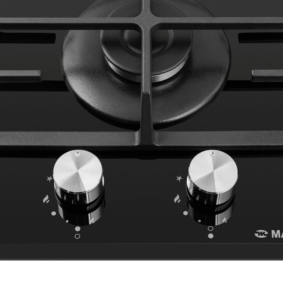 Панель выполнена из закаленного стекла черного цвета. Две стандартные конфорки мощностью 1700 Вт и 2600 Вт. с высококачественными итальянскими горелками «Sabaf».
