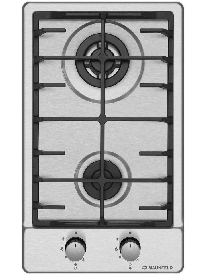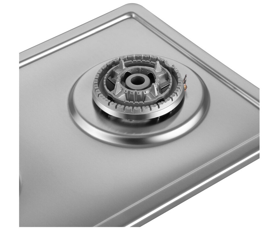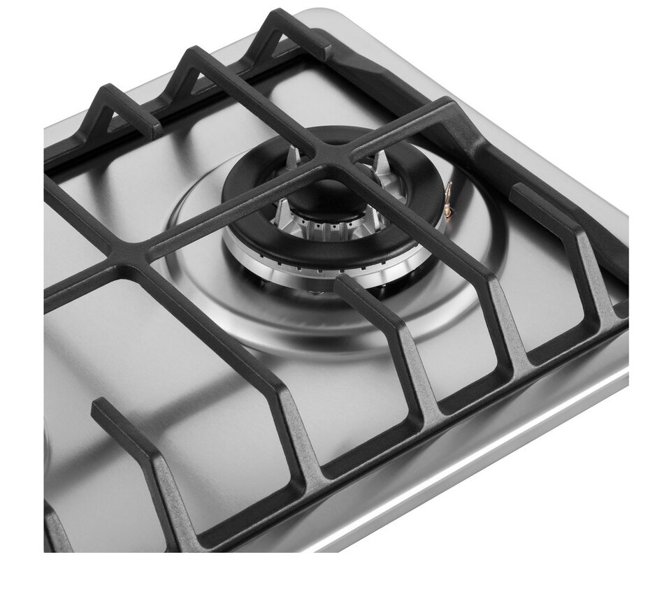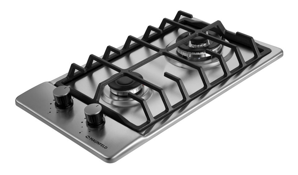 Панель выполнена из нержавеющей стали. В данной модели установлены высококачественные итальянские горелки «Sabaf». Одна стандартная конфорка мощностью 1700 Вт и одна WOK-конфорка двойным пламенем3000 Вт. Чугунная решетка имеет крестообразные соединения над конфорками, что позволяет готовить в посуде разного диаметра, не используя специальные подставки.