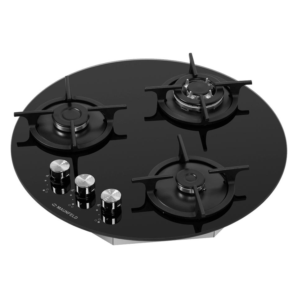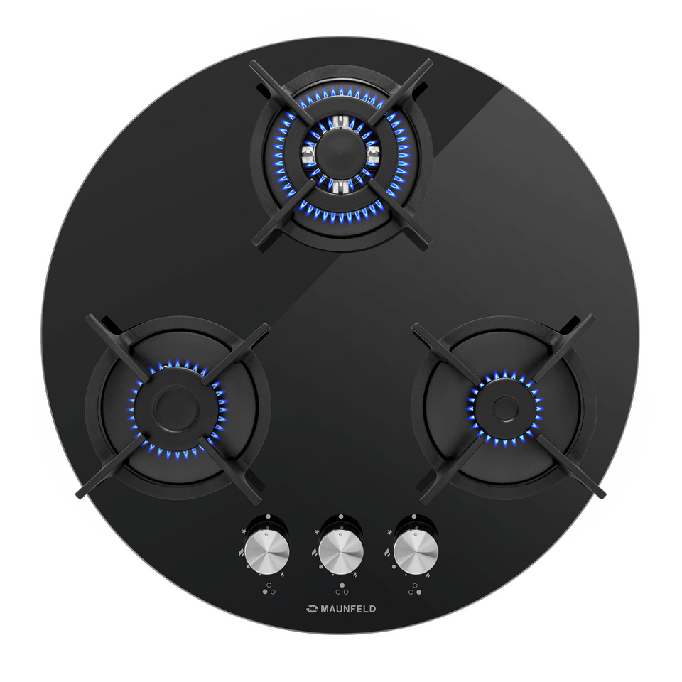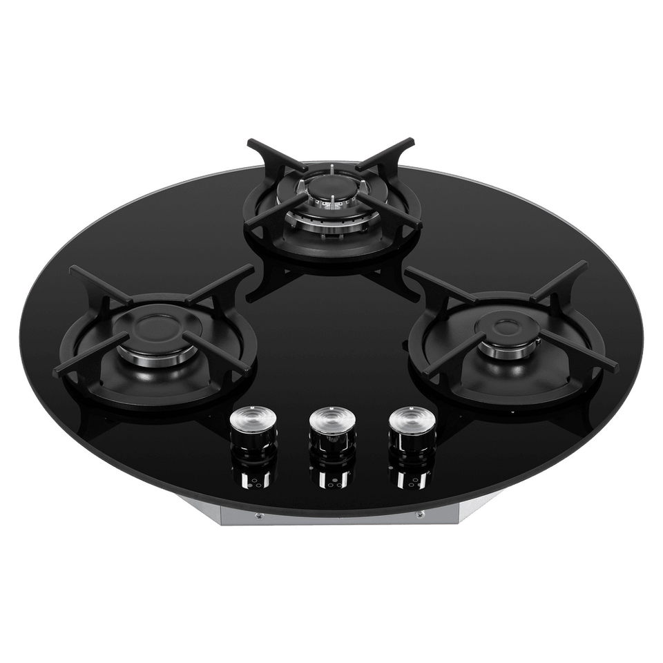 Дизайнерская круглая газовая варочная панель, выполненная из закаленного стекла, является идеальным решением для угловой столешницы.