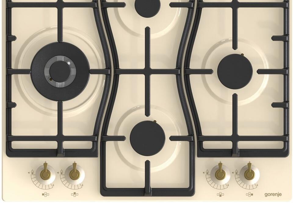 Варочная панель Gorenje GW6D42CLI выполнена в цвете слоновой кости и бронзы с добавлением чёрного. Им служат чугунные решётки. Они имеют затейливую форму, но при этом идеально гладкие, поэтому надёжно удержат всю кухонную утварь. Кроме того, они не деформируются от воздействия огня. Безопасность играет для фирмы немалую роль, поэтому в поворотные регуляторы встроена система автоматического электроподжига. Так вы избежите взаимодействия с открытым пламенем. Если вдруг оно потухнет, то в течение 5 секунд сработает система газ-контроля. Она перекроет подачу газа к конфорке. Так вы избежите утечки и отравления.