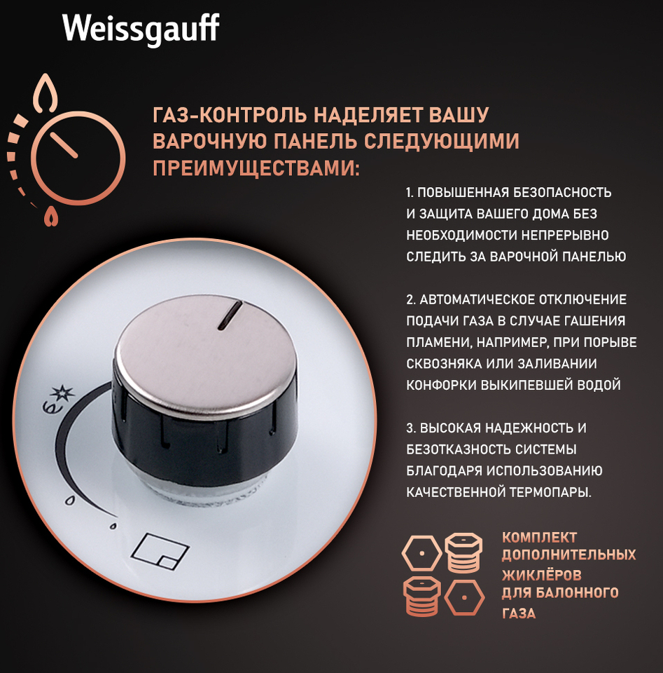 Газ-контроль каждой конфорки обеспечивает наивысшую безопасность: в случае, если пламя погасло, подача газа будет автоматически прекращена!
