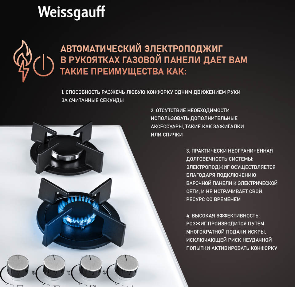 Встраиваемая независимая газовая панель Weissgauff шириной 60 см, исполненная в закалённом белом стекле - это стильное и компактное решение для вашей кухни!