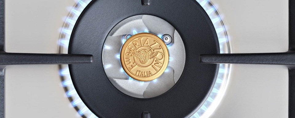 Поверхность сделана из нержавеющей стали, латунные горелки расположены на достаточном расстоянии друг от друга, чтобы работать с техникой было комфортно и безопасно. Конфорки защищены чугунными решетками. Поворотные регуляторы смещены вправо относительно самой большой и мощной зоны — WOK. Она имеет два ряда пламени, благодаря чему можно настроить нужную мощность и температуру под разные блюда.