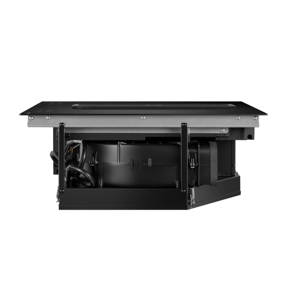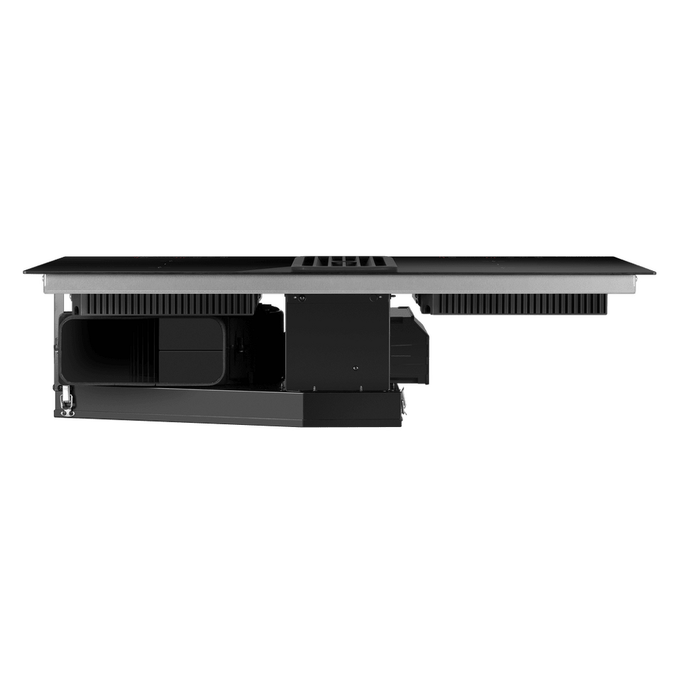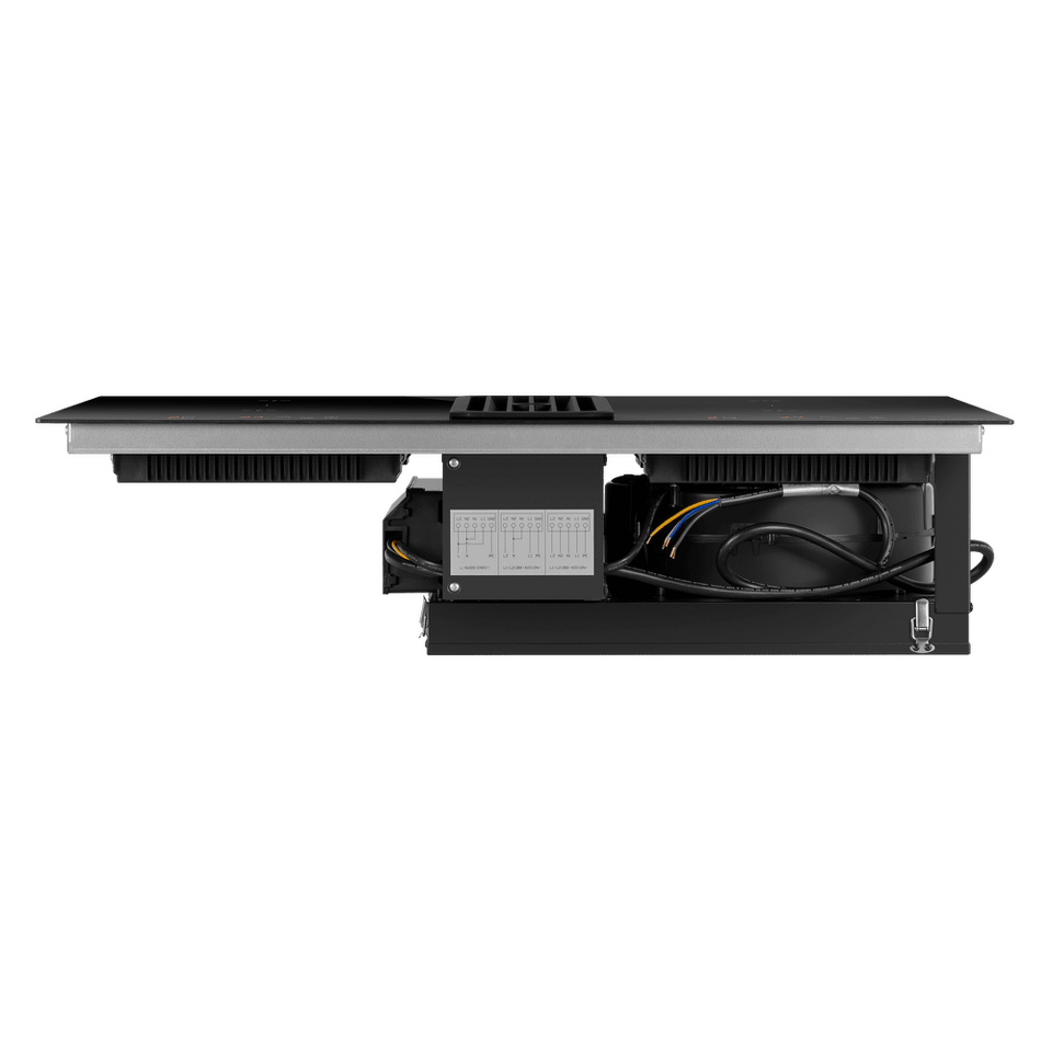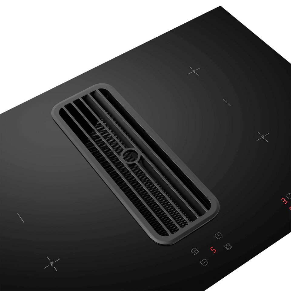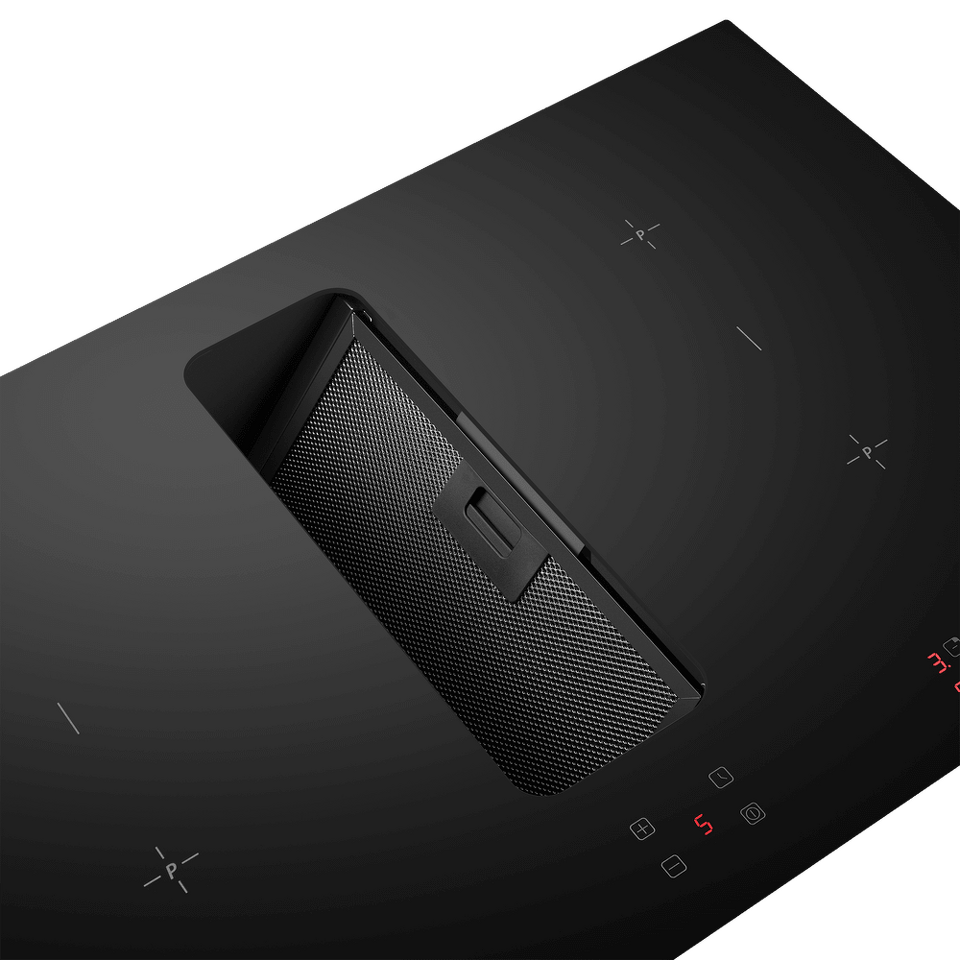 • Четыре независимые варочные зоны расположены на черном закаленном стекле. В центре находится элегантная и прочная решетка, которая скрывает мощную зону вытяжки.