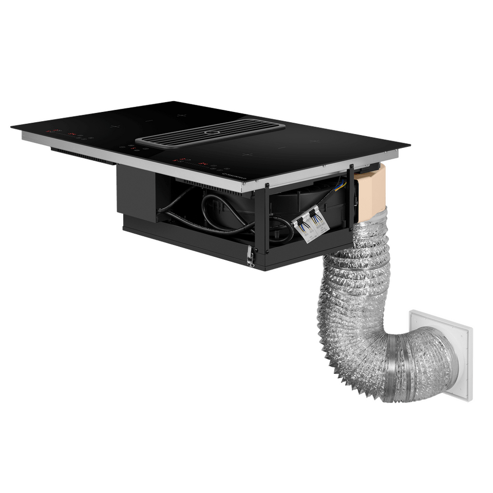 В варочную панель встроена вытяжка, поэтому отдельного прибора для очистки воздуха вам не понадобится. Все запахи и испарения не успеют покинуть зону плиты. Подключение вытяжки подразумевает два варианта: 1. в вентиляционное отверстие. 2. работа в режиме рециркуляции с использованием угольного фильтра.
