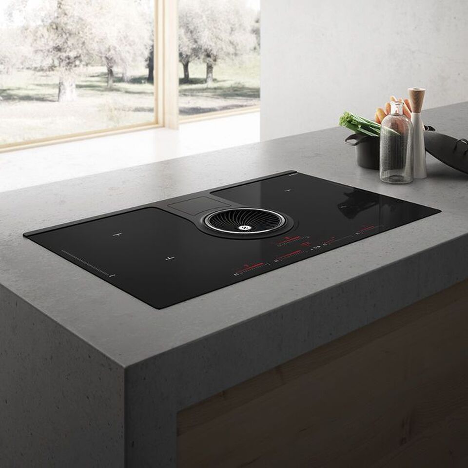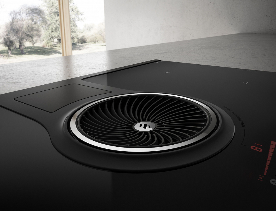 Дизайн. Революционная модель ELICA NIKOLATESLA HP BL/F/ 83 — индукционная варочная панель на 4 конфорки со встроенной мощной вытяжкой. Черная стеклокерамическая модель с фронтальной стороны дополнена панелью управления обоими устройствами.