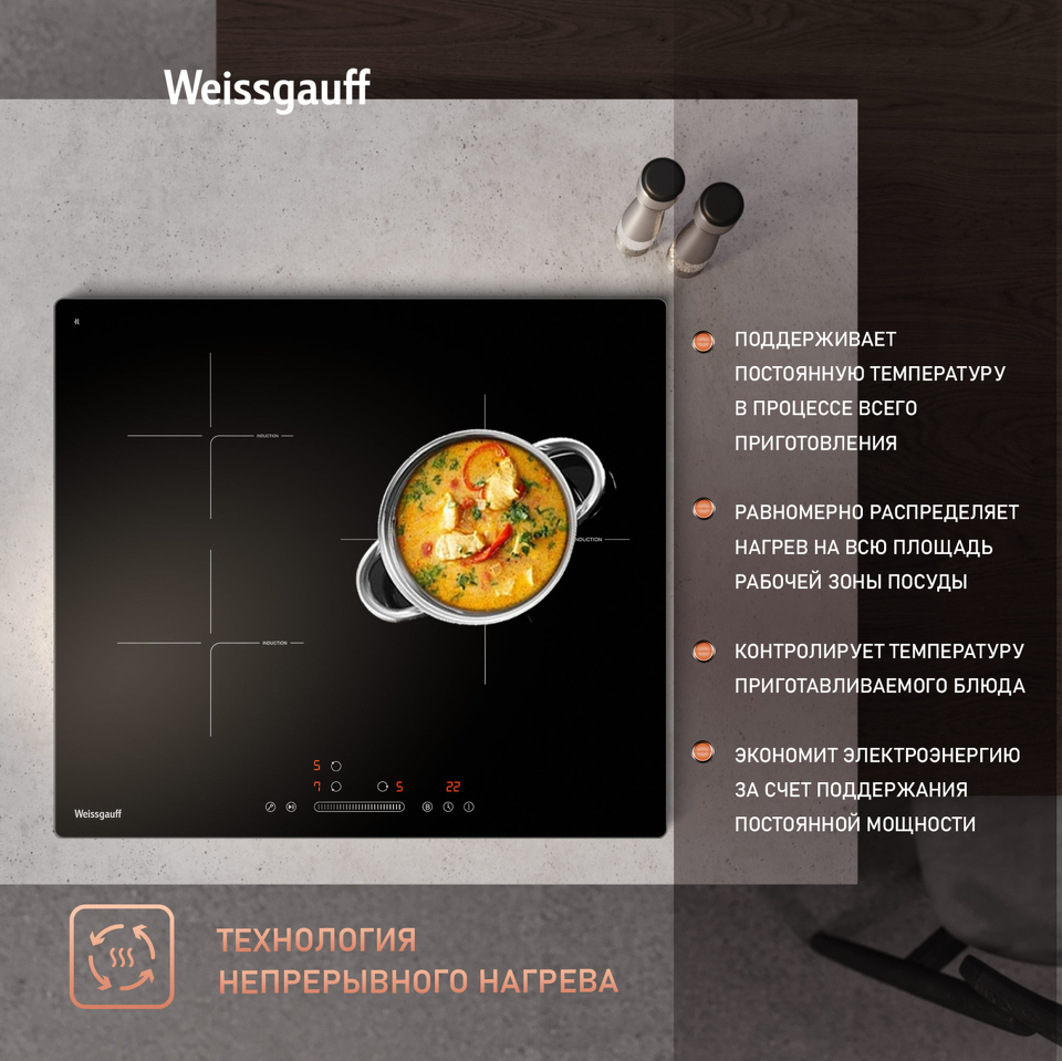 Индукционная панель Weissgauff с особым дизайном конфорок Cross-Zone и непрерывным нагревом выводит на новый уровень понимание того, насколько удобной и просторной может быть рабочая поверхность с тремя конфорками!
