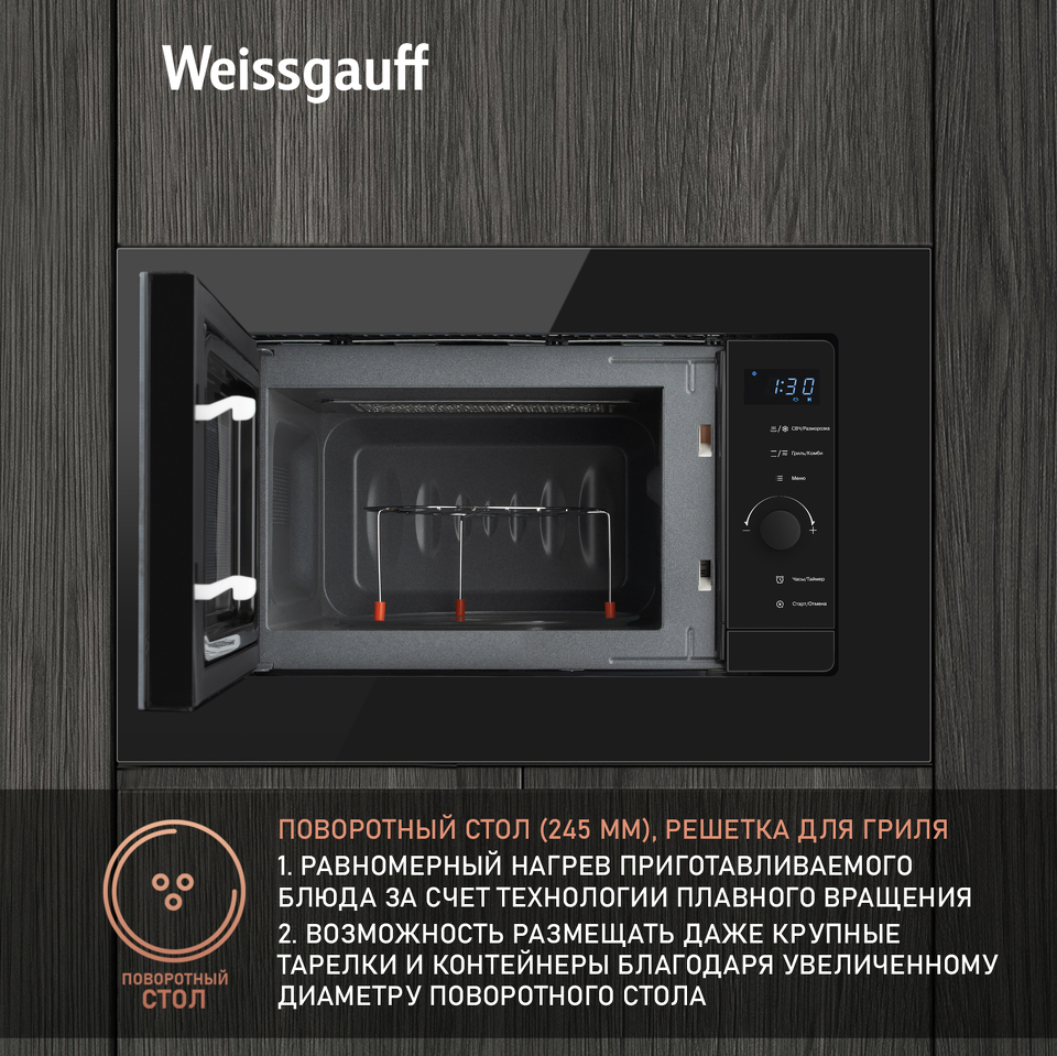 Встраиваемая микроволновая печь Weissgauff с объемом 20 литров, выполненная в черном закаленном стекле, равномерно разогревает еду при помощи поворотного стола, а также оснащена грилем с возможностью работы в комбинированном режиме и набором программ автоменю!