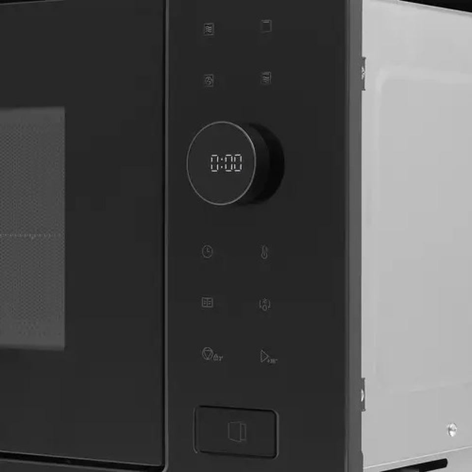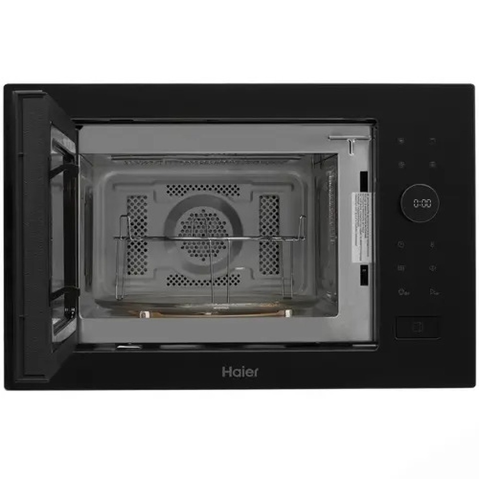 Встраиваемая микроволновая печь Haier HMX-BPG259B представлена в черном корпусе со стеклянной фронтальной панелью и дверцей с кнопкой. Вы можете управлять работой устройства с помощью поворотного рычага и сенсорных кнопок. Дисплей со встроенными часами показывает время до конца программы и активные функции.