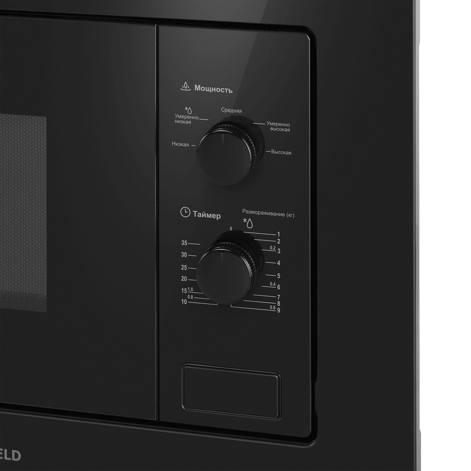 Управление СВЧ осуществляется с помощью 2 поворотных переключателей. Первая ручка – это выбор одного из 5 уровней мощности. Вторая ручка – механический таймер на 35 минут или выбор веса продукта в режиме разморозки.
