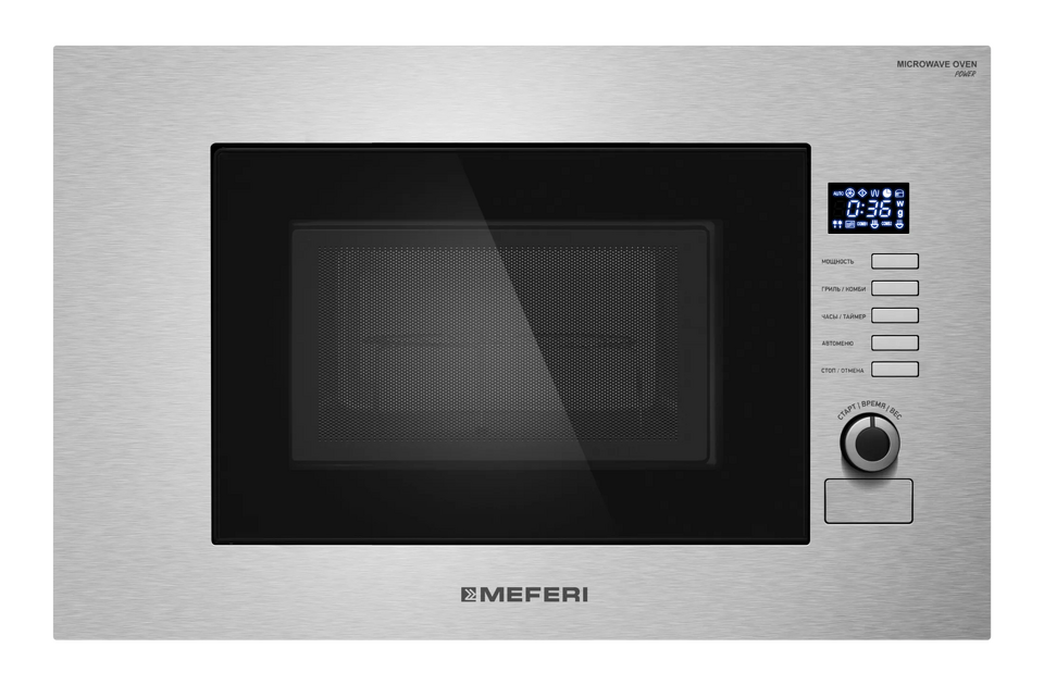 Микроволновая печь MEFERI MMO6020IX SLIM POWER — это стильное и функциональное решение для современной кухни, сочетающее надежность, мощность и современный дизайн.Компактная конструкция для встраивания: Благодаря небольшим габаритам микроволновую печь можно легко встроить в верхнюю полку кухонного гарнитура, оптимально используя пространство.Максимальная мощность 1200 Вт: Обеспечивает быстрое и равномерное приготовление блюд, сокращая время на кулинарные процессы и повышая комфорт использования.Элегантный дизайн из нержавеющей стали: Стильный внешний вид с корпусом из нержавеющей стали делает эту модель универсальной и подходящей под любой интерьер кухни, придавая ей современный и премиальный вид.Комбинированное управление и дисплей: Удобное управление в сочетании с ярким дисплеем позволяет легко настраивать режимы и контролировать процесс приготовления.8 программ авто-меню + режимы разогрева и разморозки по весу: Модель оснащена 8 автоматическими программами, включая настройку по весу, а также режимами разогрева и разморозки, что делает процесс максимально простым и точным.Гриль и решетка в комплекте: Встроенный кварцевый гриль и решетка позволяют готовить блюда с аппетитной корочкой, расширяя кулинарные возможности.Разморозка по весу: Точная разморозка по весу обеспечивает равномерное и безопасное размораживание продуктов без лишних усилий.Таймер до 95 минут и кнопка быстрого старта: Продвинутые функции позволяют точно контролировать время приготовления и быстро запускать процесс разогрева блюд.Защита от детей и внутреннее покрытие из нержавеющей стали: Обеспечивают безопасность и легкость в уходе за техникой.Диаметр поворотного стола 245 мм: Обеспечивает равномерное прогревание и размораживание больших порций.