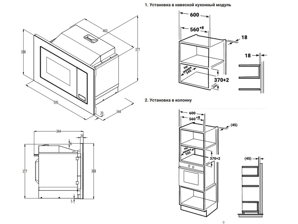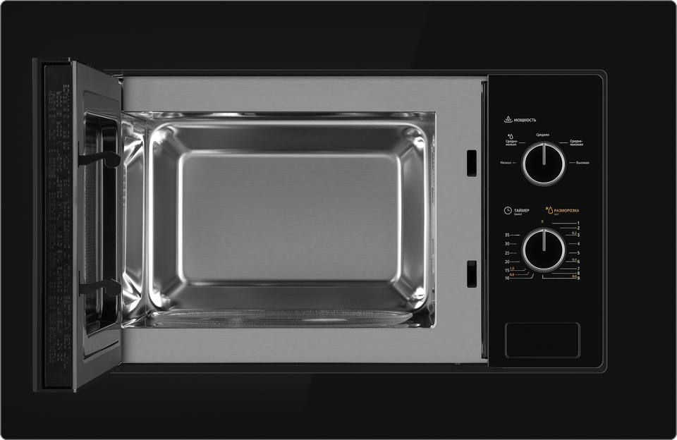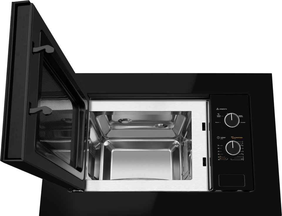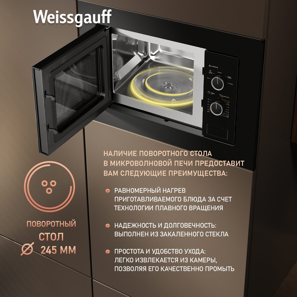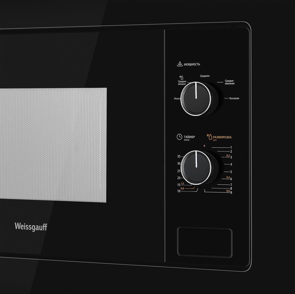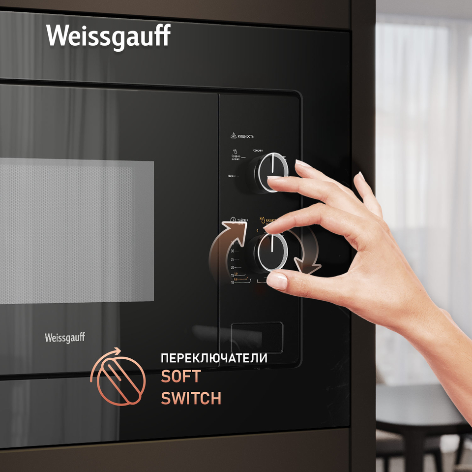 Встраиваемая микроволновая печь Weissgauff с объемом 20 литров, выполненная в черном цвете, оснащённая механическими поворотными рукоятками Soft Switch, равномерно разогревает еду при помощи поворотного стола!