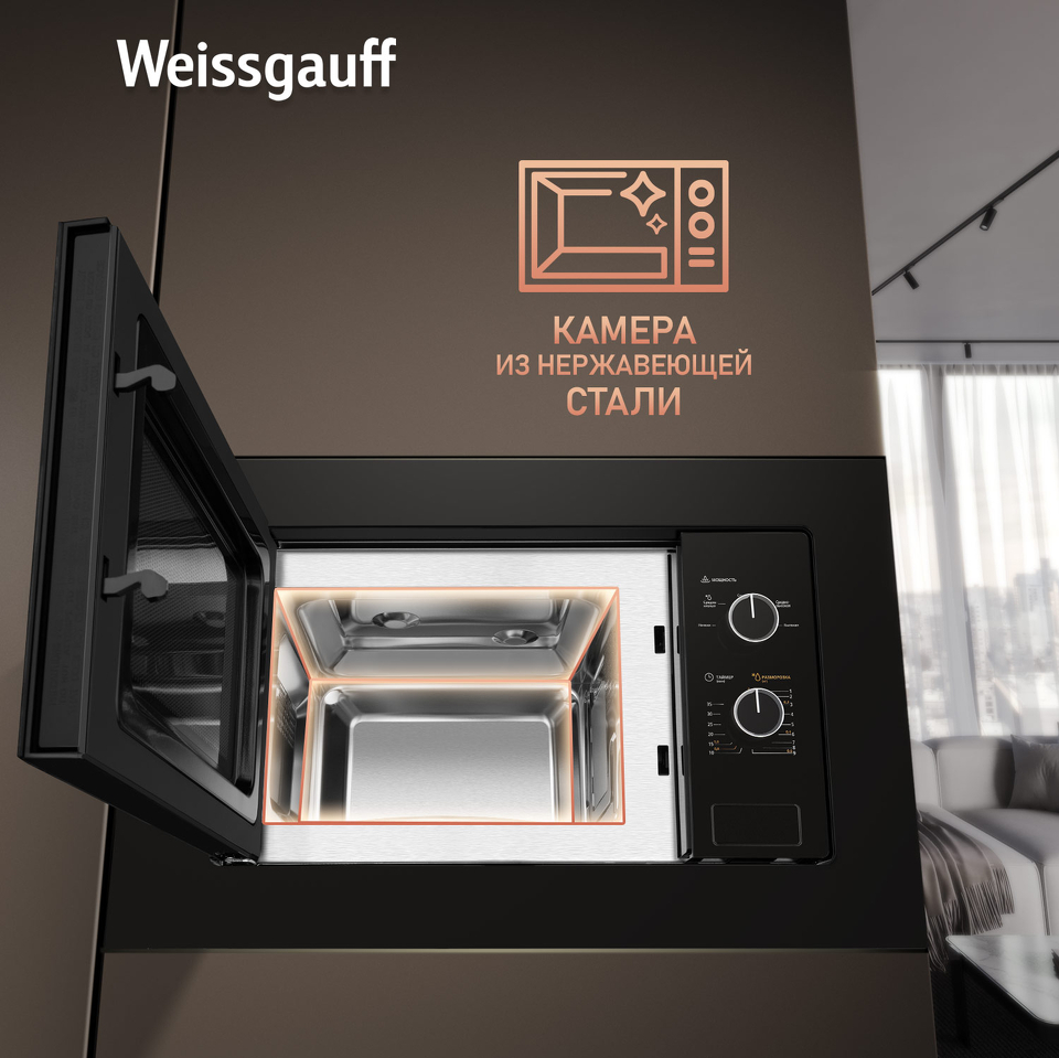 Дизайн, выполненный в черном цвете, станет финальным штрихом в совершенстве великолепного облика этой модели. Каждый раз, взаимодействуя с вашей микроволновой печью от Weissgauff, вы будете чувствовать, что это не только функциональное устройство, но и настоящее украшение вашей кухни!