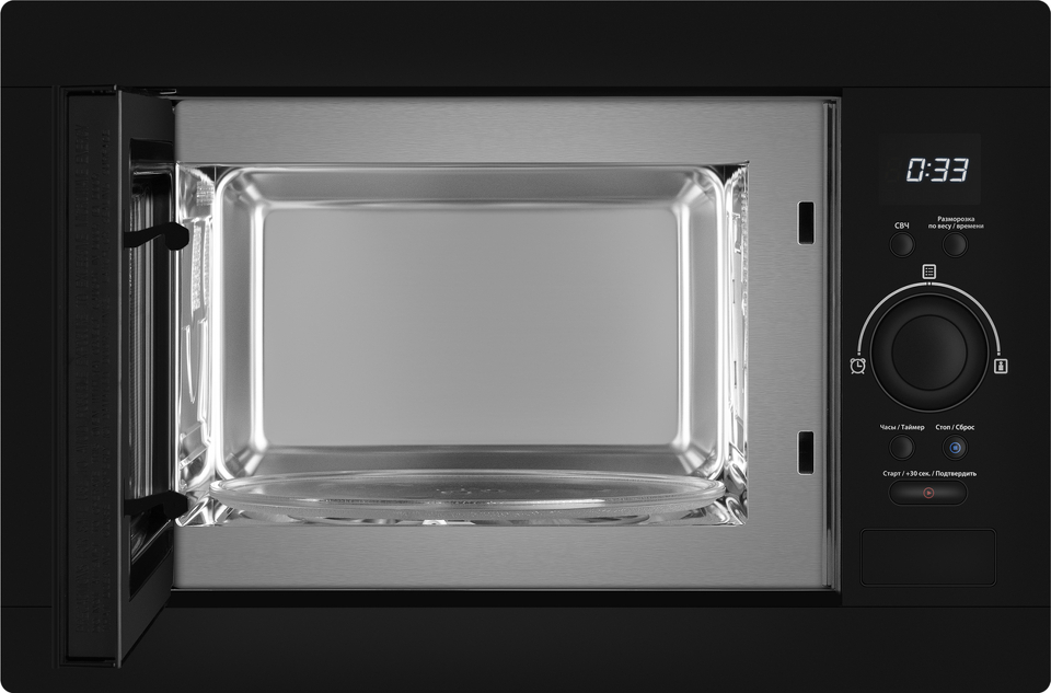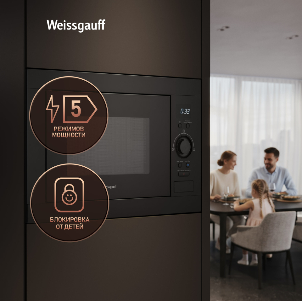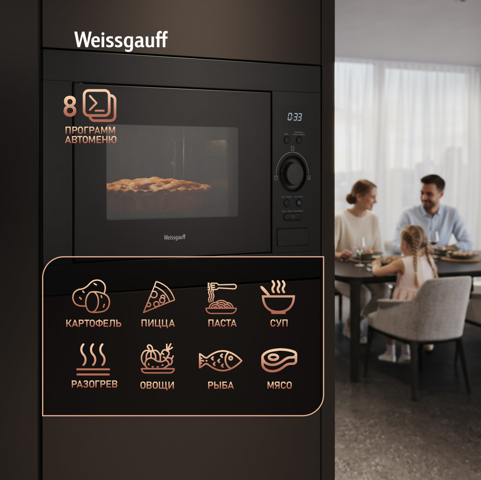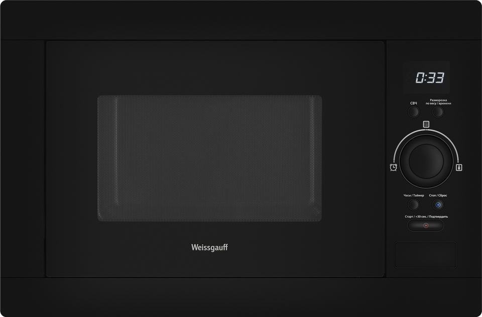 Встраиваемая микроволновая печь Weissgauff с объемом 25 литров, выполненная в черном цвете, равномерно разогревает еду при помощи поворотного стола, а также оснащена набором из 8 программ автоменю!