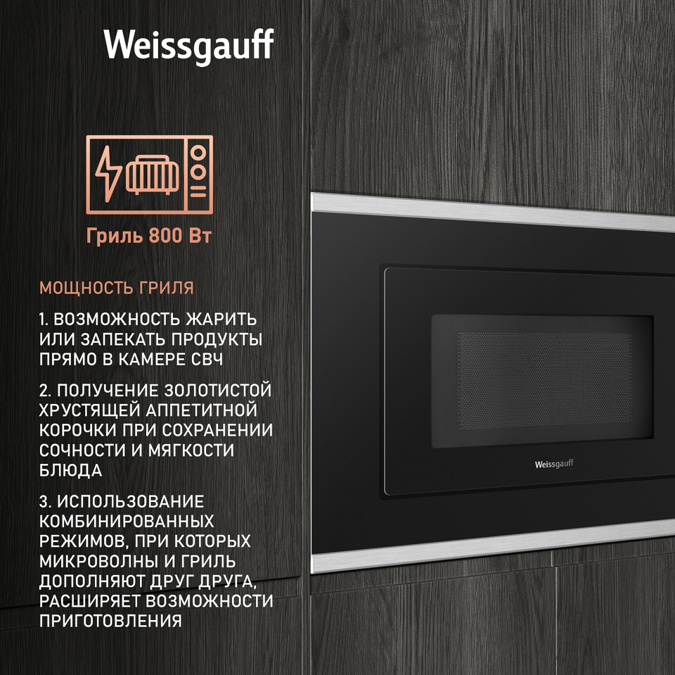Встраиваемая микроволновая печь Weissgauff с объемом 20 литров, выполненная в черном закаленном стекле со вставками из нержавеющей стали, равномерно разогревает еду при помощи поворотного стола, а также оснащена грилем с возможностью работы в комбинированном режиме!