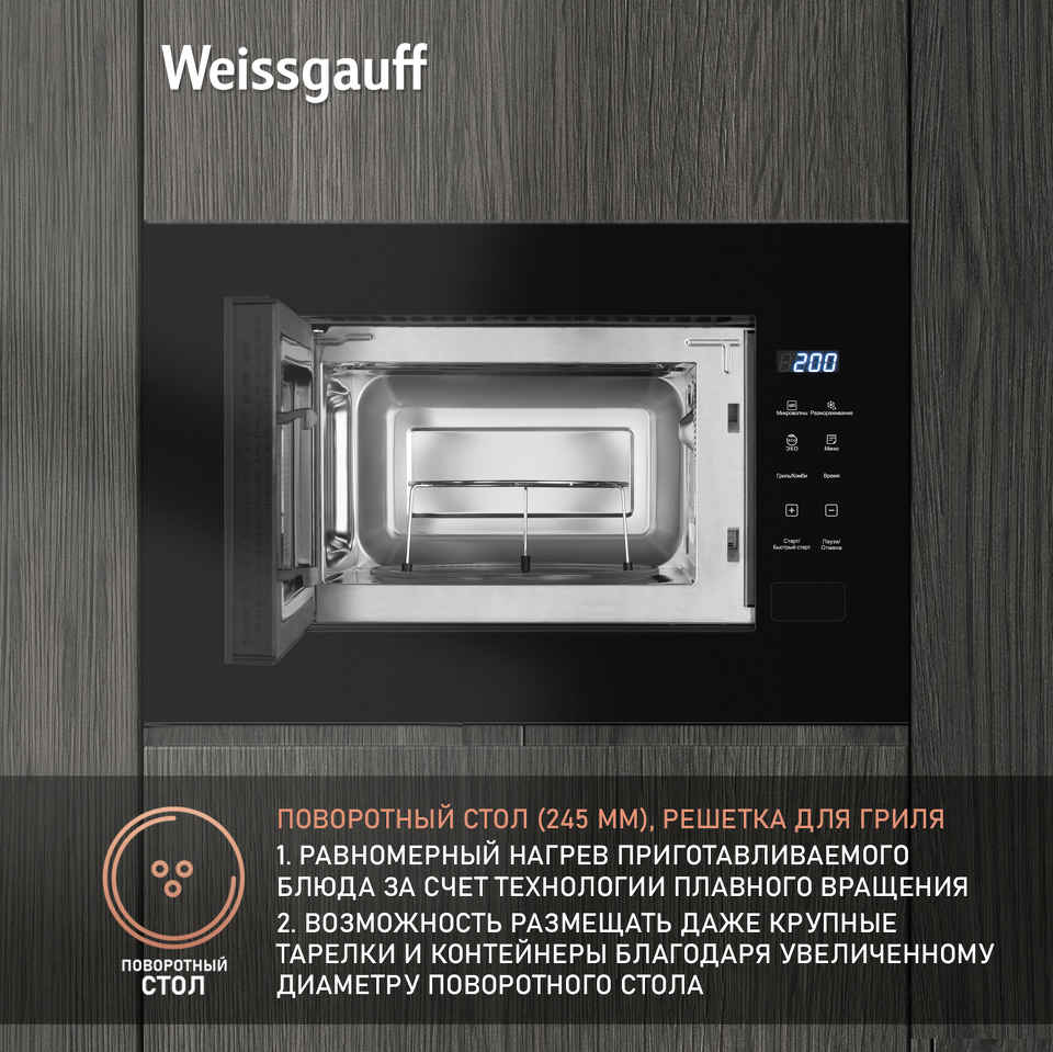 Встраиваемая микроволновая печь Weissgauff с объемом 20 литров, выполненная в дизайне Compact, сохраняющем свободное место на вашей кухне, с панелью управления в черном цвете, равномерно разогревает еду при помощи поворотного стола, а также оснащена грилем с возможностью работы в комбинированном режиме!