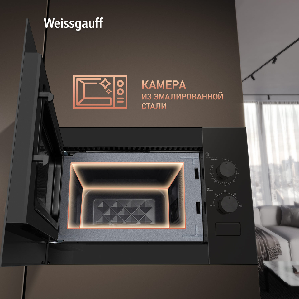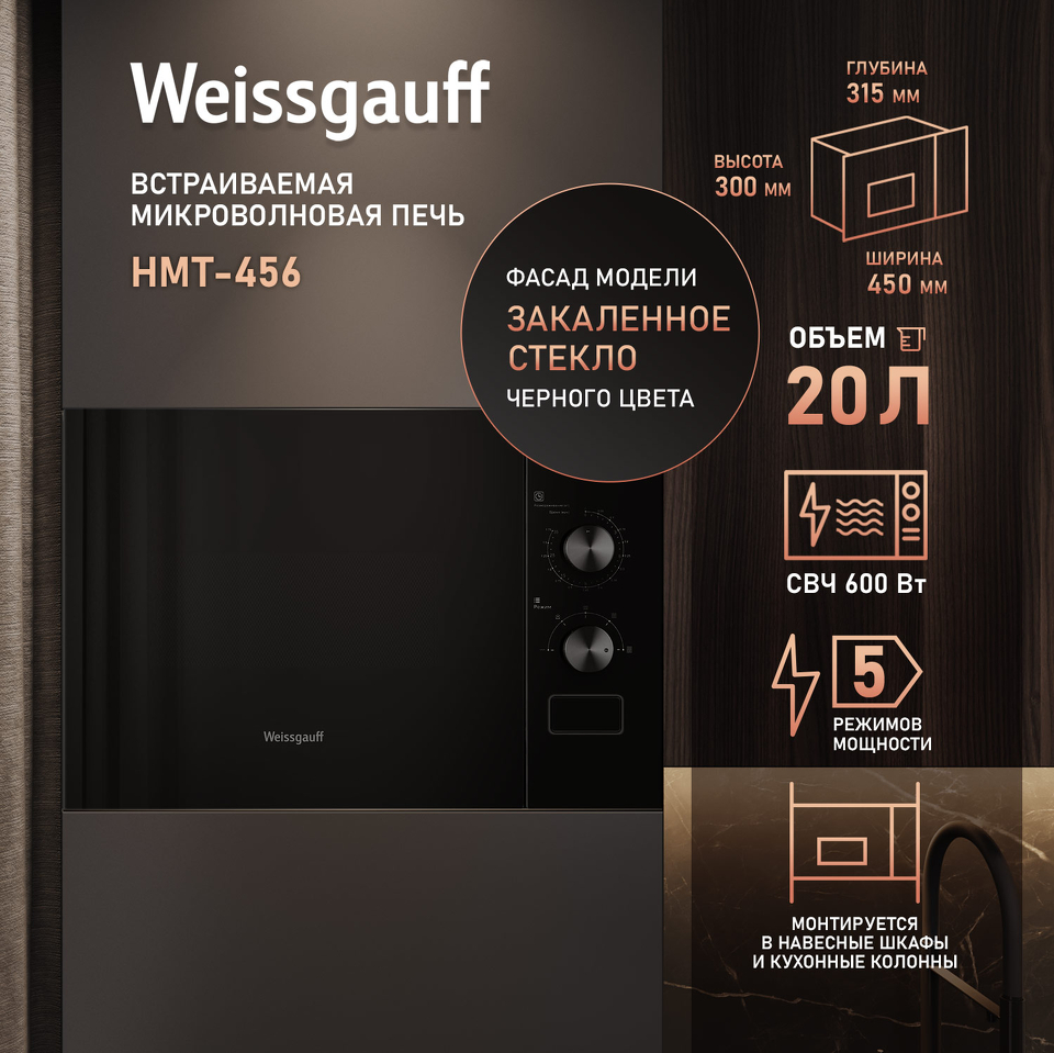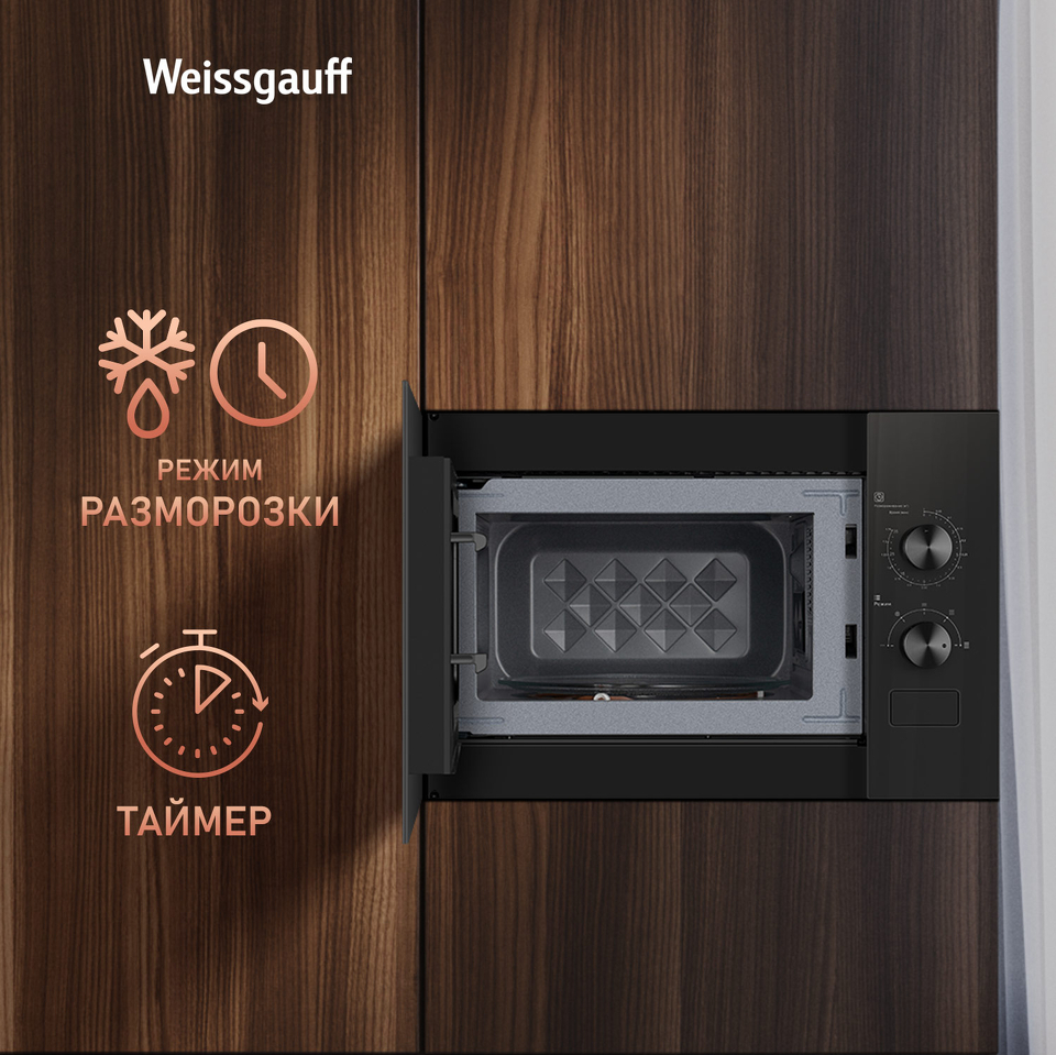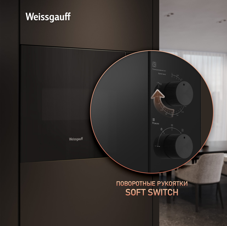 Встраиваемая микроволновая печь Weissgauff шириной 45 сантиметров, выполненная в чёрном закаленном стекле, оснащённая механическими поворотными рукоятками Soft Switch, имеющая объем 20 литров - это настоящее воплощение основного принципа Weissgauff: "Качество, доступное каждому"