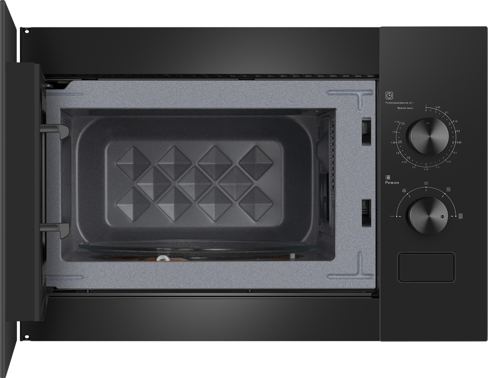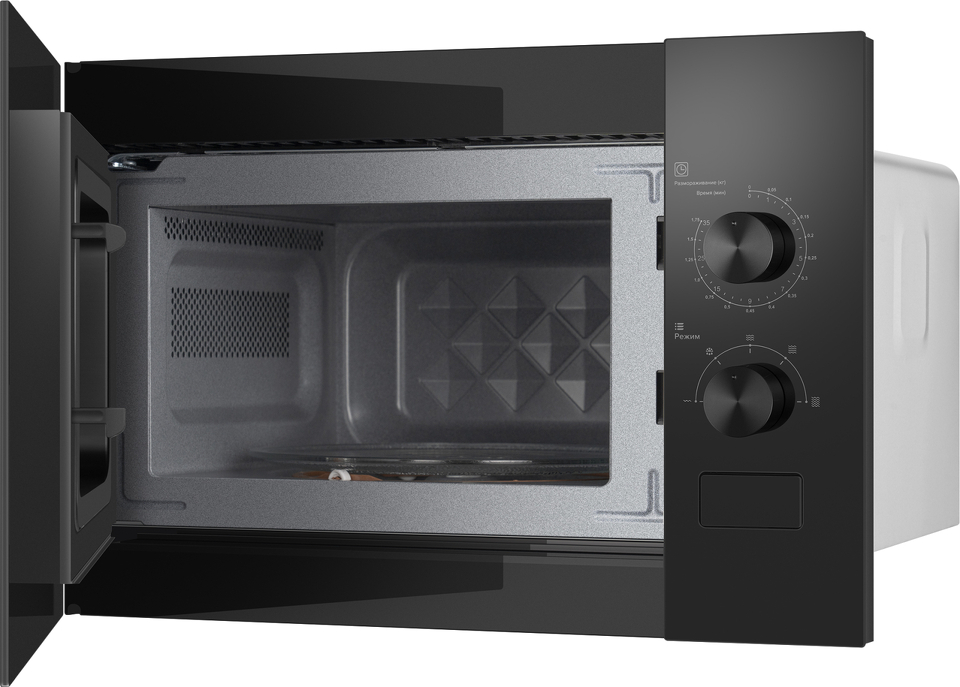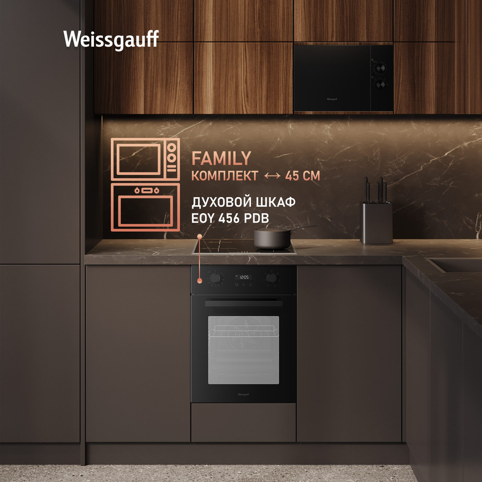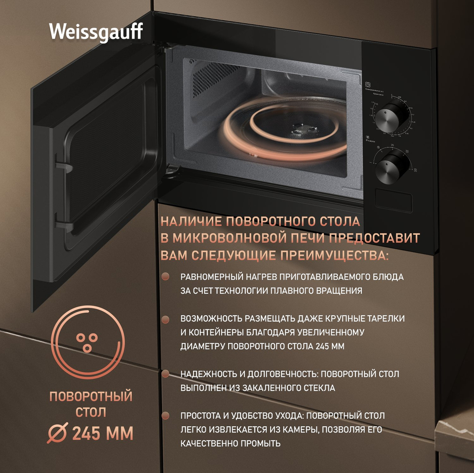 Встраиваемая микроволновая печь Weissgauff шириной 45 сантиметров, выполненная в чёрном закаленном стекле, оснащённая механическими поворотными рукоятками Soft Switch, имеющая объем 20 литров - это настоящее воплощение основного принципа Weissgauff: "Качество, доступное каждому"