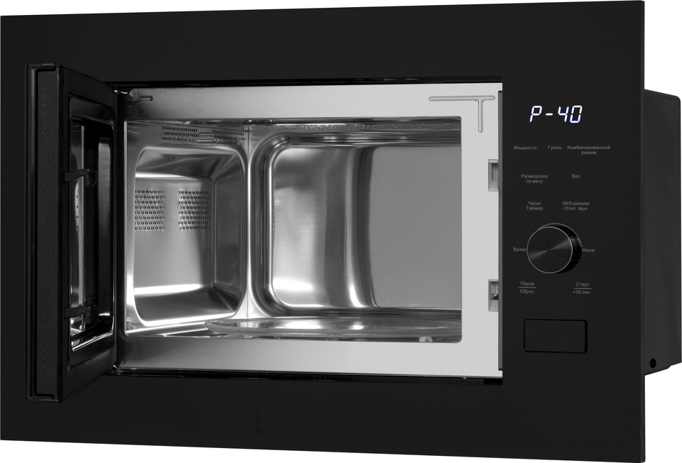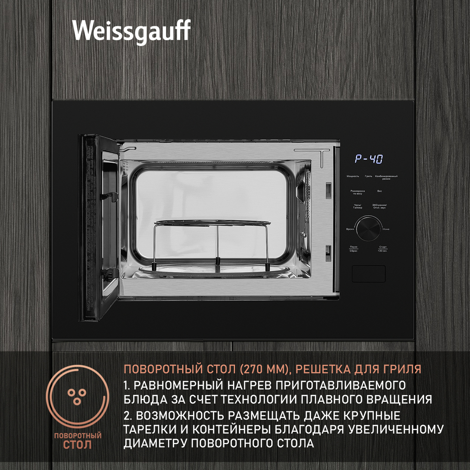 Встраиваемая микроволновая печь Weissgauff с объемом 25 литров, выполненная в черном цвете, равномерно разогревает еду при помощи поворотного стола, а также оснащена грилем с возможностью работы в комбинированном режиме и набором программ автоменю!