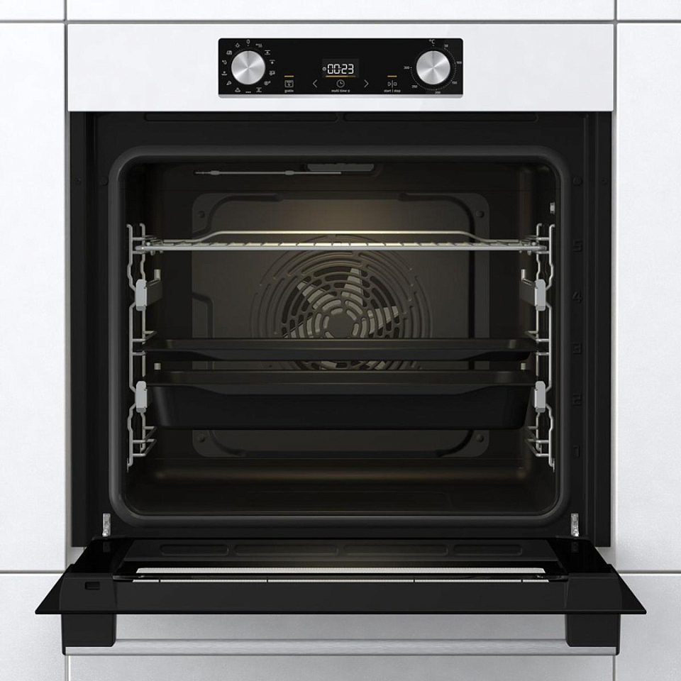 Духовой шкаф Gorenje BOS6737E09WG — элегантная модель в белом цвете. В приборе предусмотрена каталитическая система очистки. Когда температура в камере достигает 85°С каталитическая крышка вентилятора начинает поглощать жир и прочие загрязнения и расщеплять их, что значительно упрощает уход.