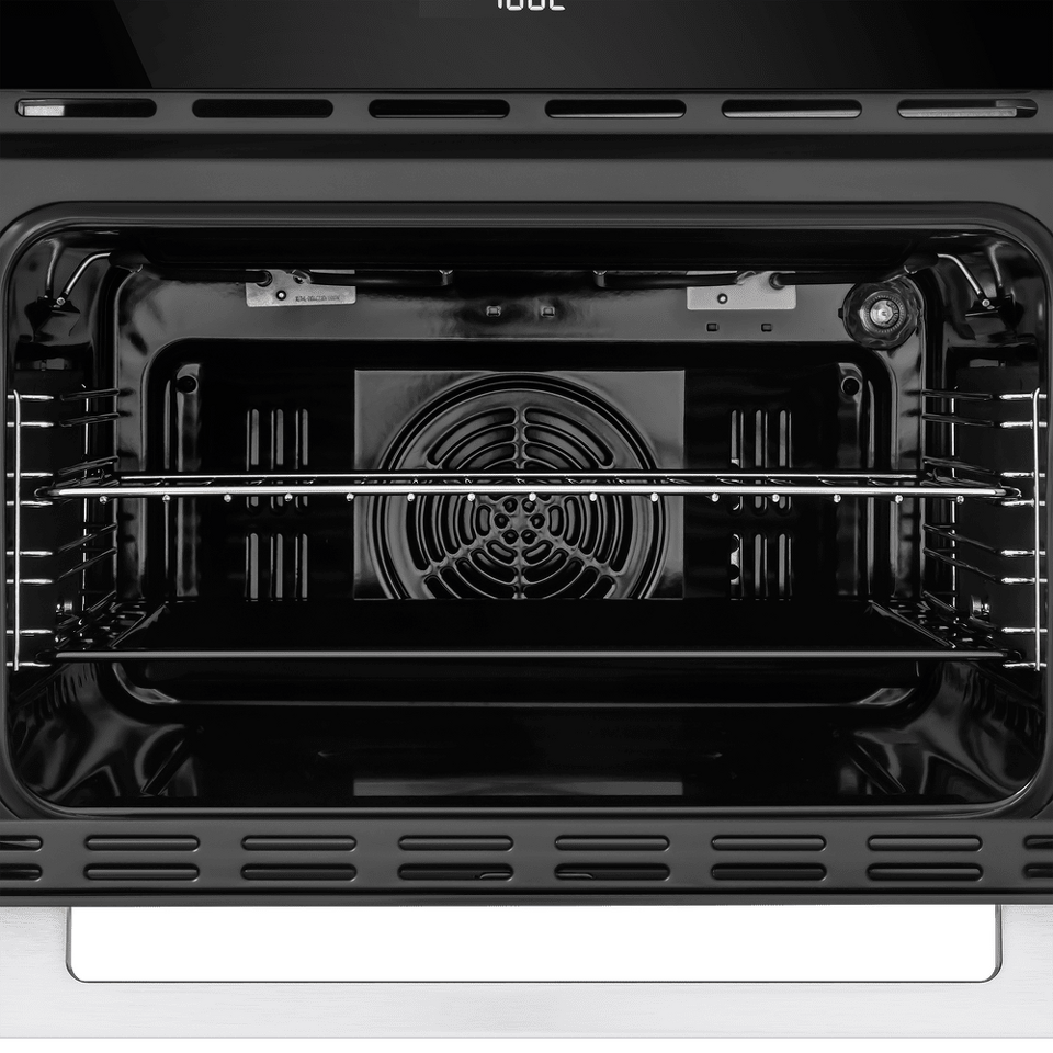 Фронтальная панель сделана из высококачественного жаропрочного стекла . Цельнометаллическая ручка дверцы из матированной нержавеющей стали лаконично поддерживает общий стиль и не нагревается во время готовки.