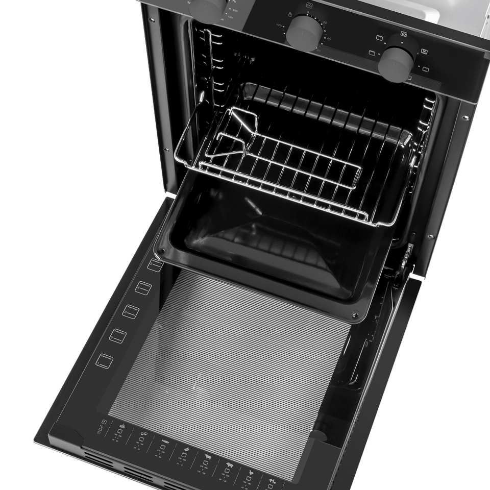 Механическое управление работой духовки осуществляется утапливаемыми поворотными ручками. Можно установить таймер (до 120 мин), выбрать температуру (50°-250°C) и один из 7-ми режимов работы: внутреннее освещение, традиционный нагрев, большой гриль, конвекция с нижним нагревом, нижний нагрев, конвекционный нагрев, малый гриль.
