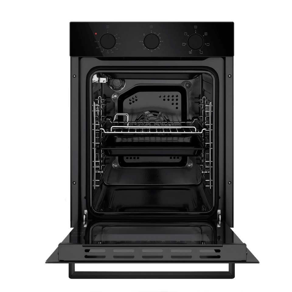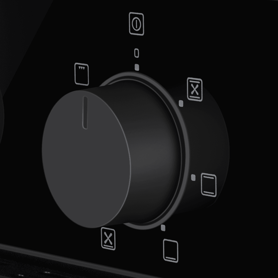 Механическое управление работой духовки осуществляется утапливаемыми поворотными ручками. Можно установить таймер (до 120 мин), выбрать температуру (50°-250°C) и один из 7-ми режимов работы: внутреннее освещение, традиционный нагрев, большой гриль, конвекция с нижним нагревом, нижний нагрев, конвекционный нагрев, малый гриль.