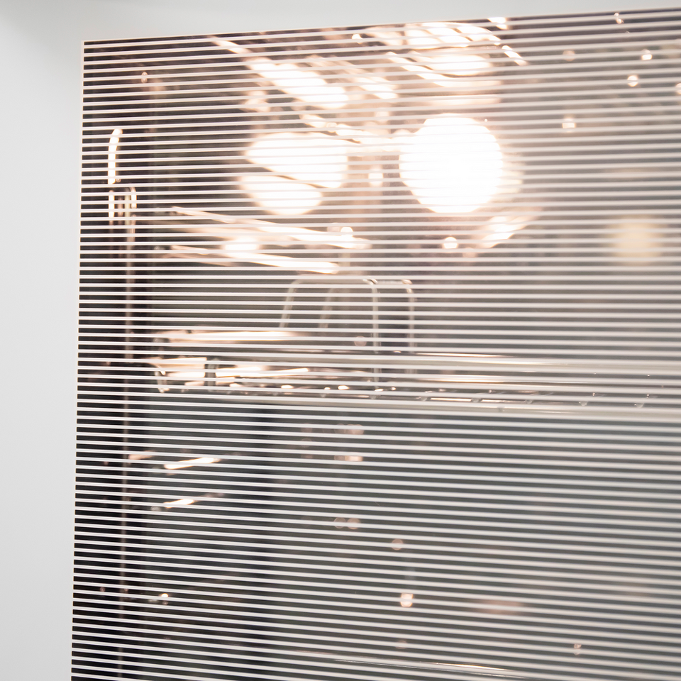 Трамп-линии нанесены на внутреннем стекле для создания эффекта непрозрачности фасада: при выключенном освещении не видно посуду, находящуюся внутри духовой камеры, а при включенном освещении можно в деталях рассмотреть весь процесс готовки.