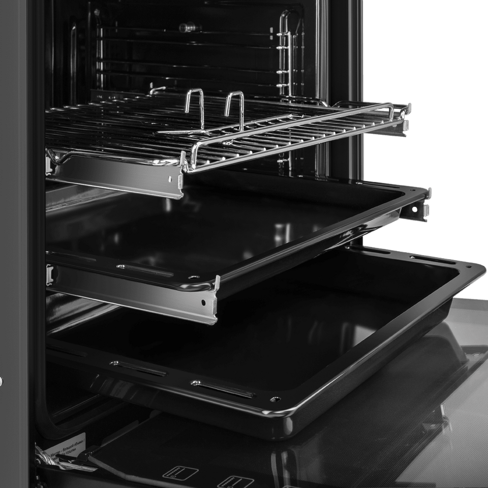 Объем 76 л при стандартных размерах 60 см позволяет готовить одновременно несколько блюд, разместив решетку или противень на одном из 6 уровней боковых направляющих. Два уровня оснащены удобными телескопическими направляющими. Внутреннее покрытие камеры выполнено из специальной легкоочищающейся эмали черного цвета.