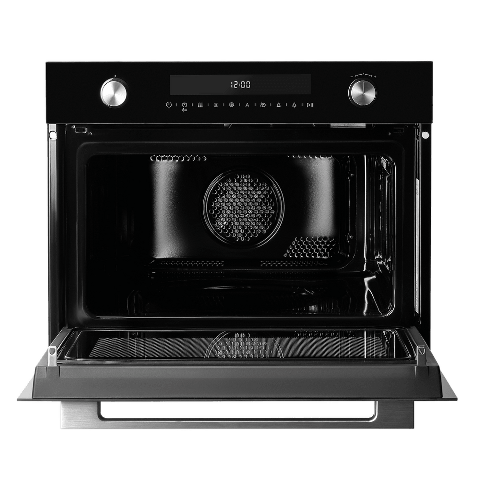 Фронтальная панель сделана из высококачественного жаропрочного стекла . Цельнометаллическая ручка дверцы из матированной нержавеющей стали лаконично поддерживает общий стиль и не нагревается во время готовки.