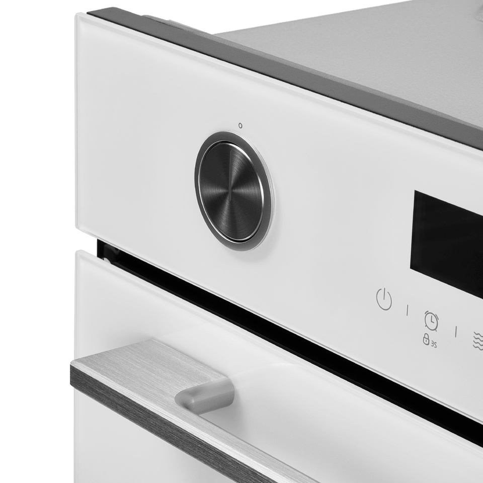 Фронтальная панель сделана из высококачественного жаропрочного стекла . Цельнометаллическая ручка дверцы из матированной нержавеющей стали лаконично поддерживает общий стиль и не нагревается во время готовки.