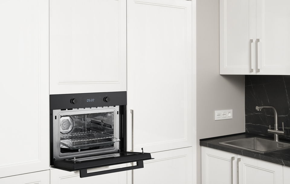 Встраиваемый компактный духовой шкаф с микроволнами , который сочетает в себе сразу два полноценных устройства: духовой шкаф с конвекцией и грилем, а также микроволновую печь с отдельными набором настроек и возможностью использования комбинированного режима.
