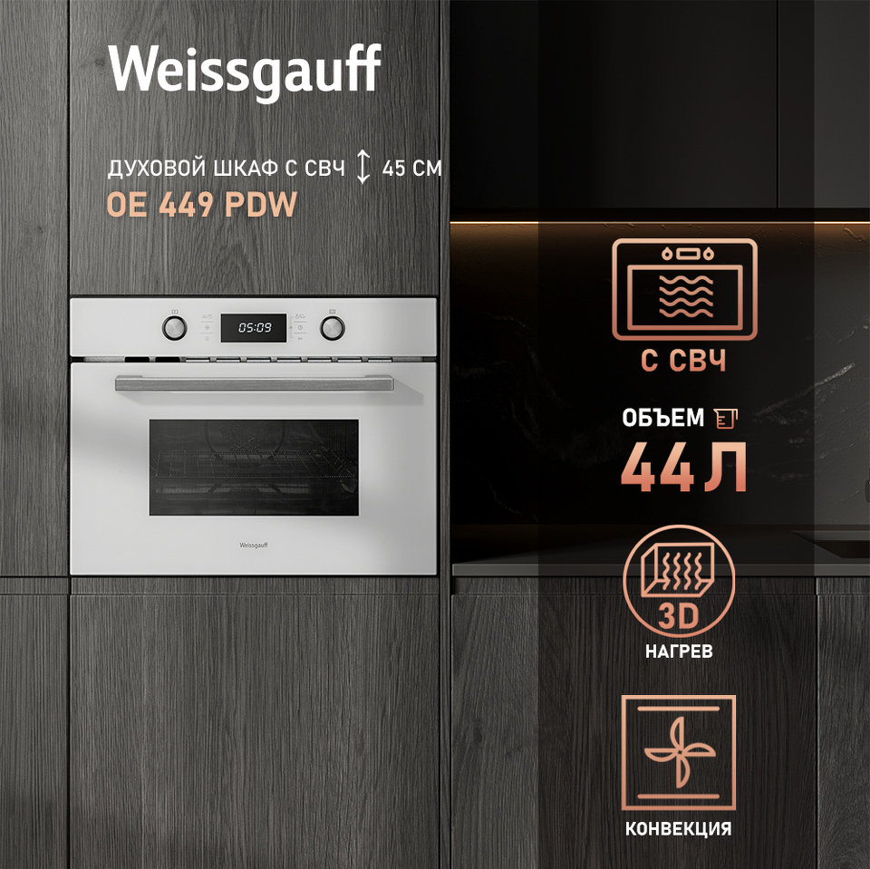 Компактный духовой шкаф с функцией СВЧ от Weissgauff, выполненный в белом цвете - это функционал сразу двух полноценных устройств, воплощённый в одной модели, оснащенной тройным стеклом в дверце и расширенной комплектацией!