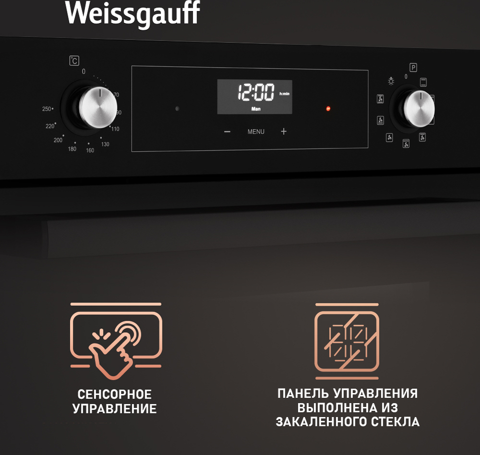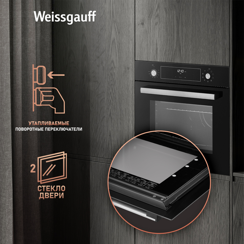 Двойное стекло дверцы, воплощающее в себе весь подход к безопасности и термозащите, который Weissgauff реализовали в данной модели. Теперь случайные прикосновения к дверце духового шкафа во время процесса приготовления еды больше будут не страшны, ведь мы позаботились о том, чтобы фронтальная сторона духового шкафа никогда не нагревалась до опасных температур.