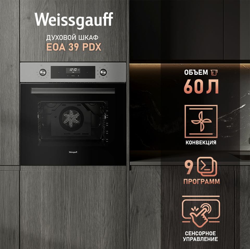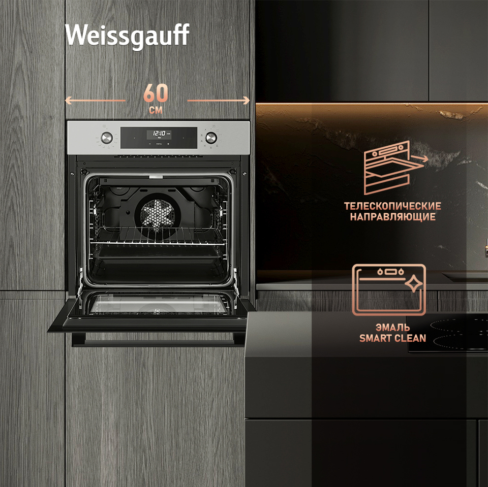 Объем XL 60 литров дает вам полную уверенность в том, что приобретая этот духовой шкаф, вы сможете разместить в нем сразу весь необходимый объем пищи, и даже профессионально работать на нескольких уровнях одновременно, порадовав себя и своих близких настоящим пиром, приготовленным в духовом шкафу Weissgauff на действительно ресторанном уровне.