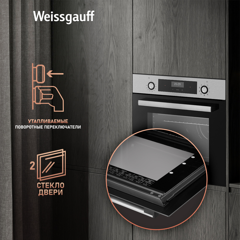 Двойное стекло дверцы, воплощающее в себе весь подход к безопасности и термозащите, который Weissgauff реализовали в данной модели. Теперь случайные прикосновения к дверце духового шкафа во время процесса приготовления еды больше будут не страшны, ведь мы позаботились о том, чтобы фронтальная сторона духового шкафа никогда не нагревалась до опасных температур.
