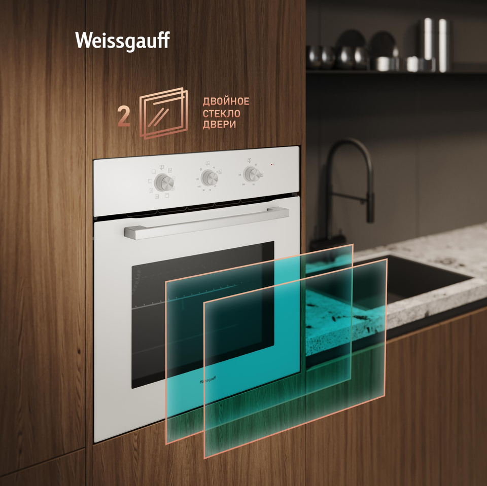 • Двойное стекло дверцы, воплощающее в себе весь подход к безопасности и термозащите, который Weissgauff реализовали в данной модели. Теперь случайные прикосновения к дверце духового шкафа во время процесса приготовления еды больше будут не страшны, ведь мы позаботились о том, чтобы фронтальная сторона духового шкафа никогда не нагревалась до опасных температур.