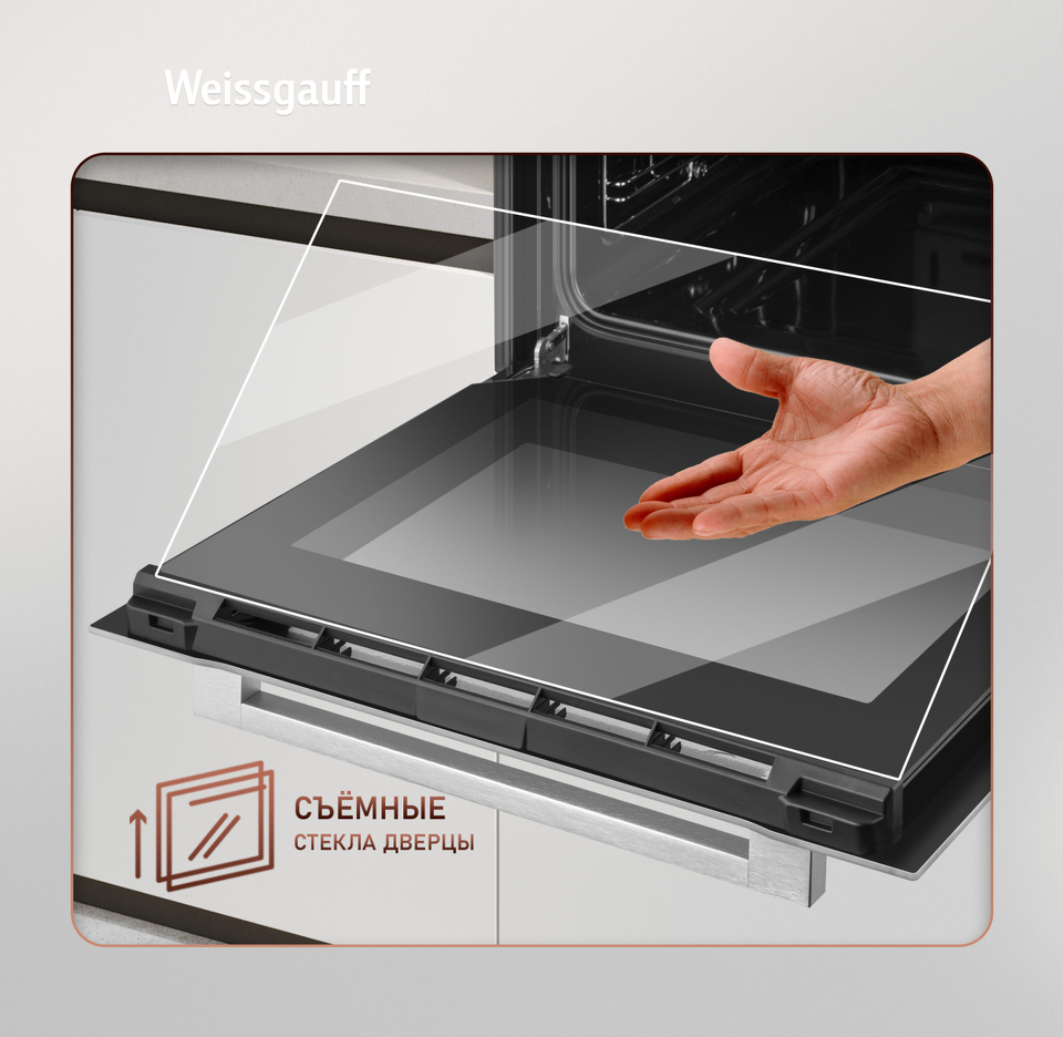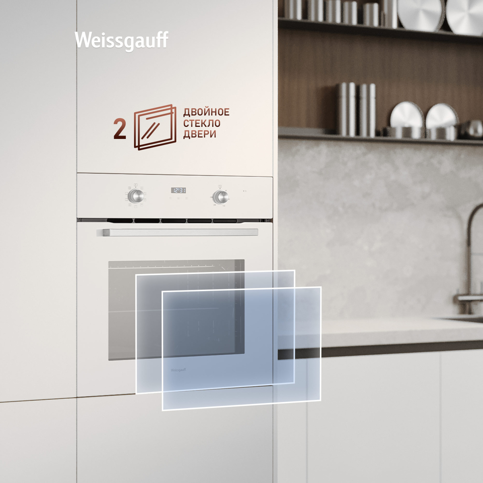 • Двойное стекло дверцы, воплощающее в себе весь подход к безопасности и термозащите, который Weissgauff реализовали в данной модели. Теперь случайные прикосновения к дверце духового шкафа во время процесса приготовления еды больше будут не страшны, ведь мы позаботились о том, чтобы фронтальная сторона духового шкафа никогда не нагревалась до опасных температур.