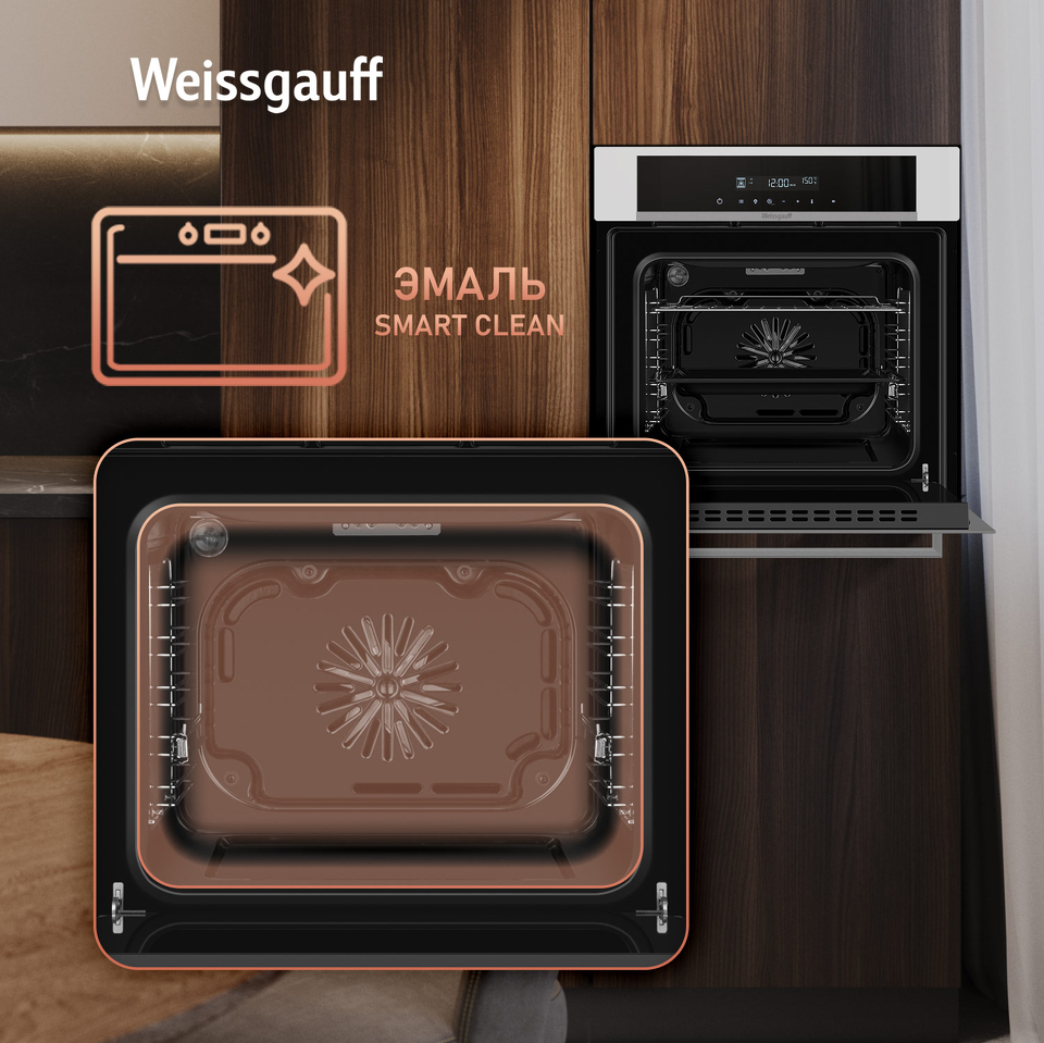 Эмаль SMART CLEAN - это особое покрытие духового шкафа, призванное сделать процесс ухода за ним еще более простым и удобным. Благодаря эмали, изготовленной и нанесенной с применением сразу ряда инновационных технологий, ваш духовой шкаф будет оснащен самым настоящим высокоэффективным щитом, препятствующим накоплению жира, запаха и загрязнений, образующихся вследствие многократного приготовления еды.