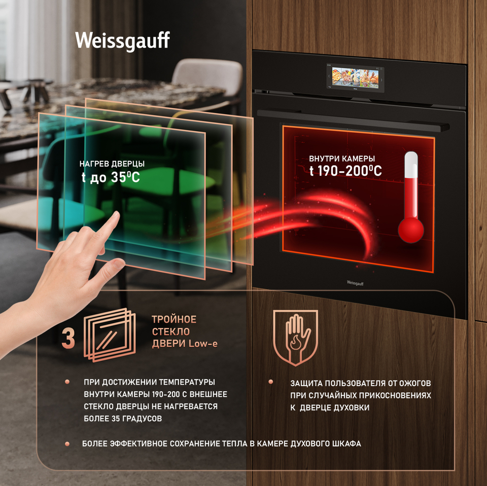 Тройное стекло дверцы, воплощающее в себе весь подход к безопасности и термозащите, который Weissgauff реализовали в данной модели. Теперь случайные прикосновения к дверце духового шкафа во время процесса приготовления еды больше будут не страшны, ведь мы позаботились о том, чтобы фронтальная сторона духового шкафа никогда не нагревалась до опасных температур.