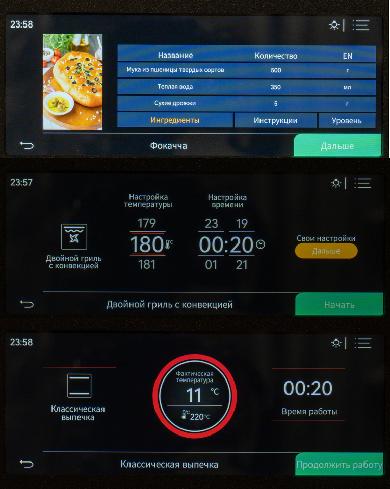 15 функций духового шкафа, предлагающих широкий выбор по-настоящему полезных и востребованных режимов: Классическая выпечка (верхний и нижний нагрев), Горячий воздух (конвекция), Интенсивная выпечка (нижний и верхний нагрев с конвекцией), Гриль, Двойной гриль с конвекцией, Двойной гриль, Пицца, Нижний нагрев, Верхний нагрев, Горячий воздух (ЭКО), Режим шеф-повара, Размораживание, Тесто, Сушеные фрукты, Поддержание тепла.