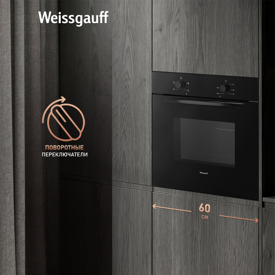 Электрический духовой шкаф от Weissgauff, выполненный в чёрном цвете с панелью из закаленного стекла, оснащённый 4 функциями приготовления и механическими поворотными рукоятками Soft Switch и двойным остеклением дверцы - это сочетание доступности и практичности в одном устройстве!
