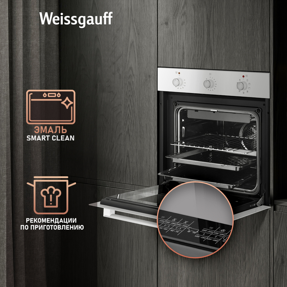 Класс энергопотребления А позволит вам еще раз убедиться в том, что Weissgauff способны создавать по-настоящему эффективные устройства, не расходующие при этом больше электричества, чем необходимо. Наслаждайтесь настоящими кулинарными шедеврами, приготовленными в нашем духовом шкафе, и при этом не тратьте лишние деньги на счета за электроэнергию - вот воплощение истинного немецкого подхода к созданию эффективной бытовой техники!