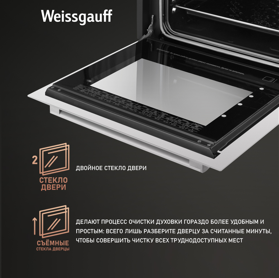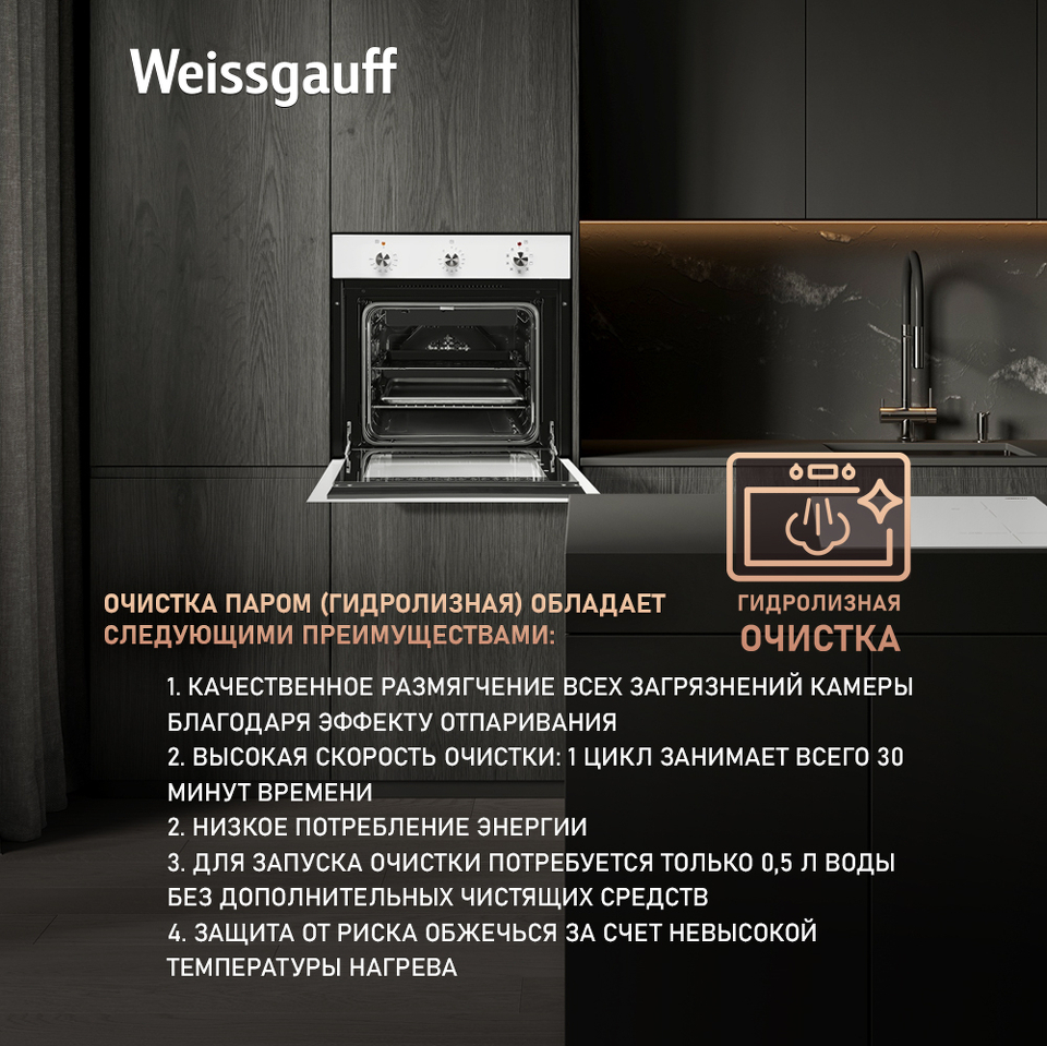 Гидролизная очистка - особая технология, благодаря который вы раз и навсегда забудете те дни, когда духовой шкаф необходимо было с большим трудом вычищать, вкладывая в это непозволительно много времени и сил. Weissgauff понимает, что в современном мире время является одной из наивысших ценностей - поэтому мы оснастили данную модель функцией гидролиза: всего лишь добавьте небольшое количество воды, и духовой шкаф сам отпарит все загрязнения, используя "эффект сауны", после чего вам останется лишь провести по стенкам мягкой губкой, собрав их и удалив одним движением.