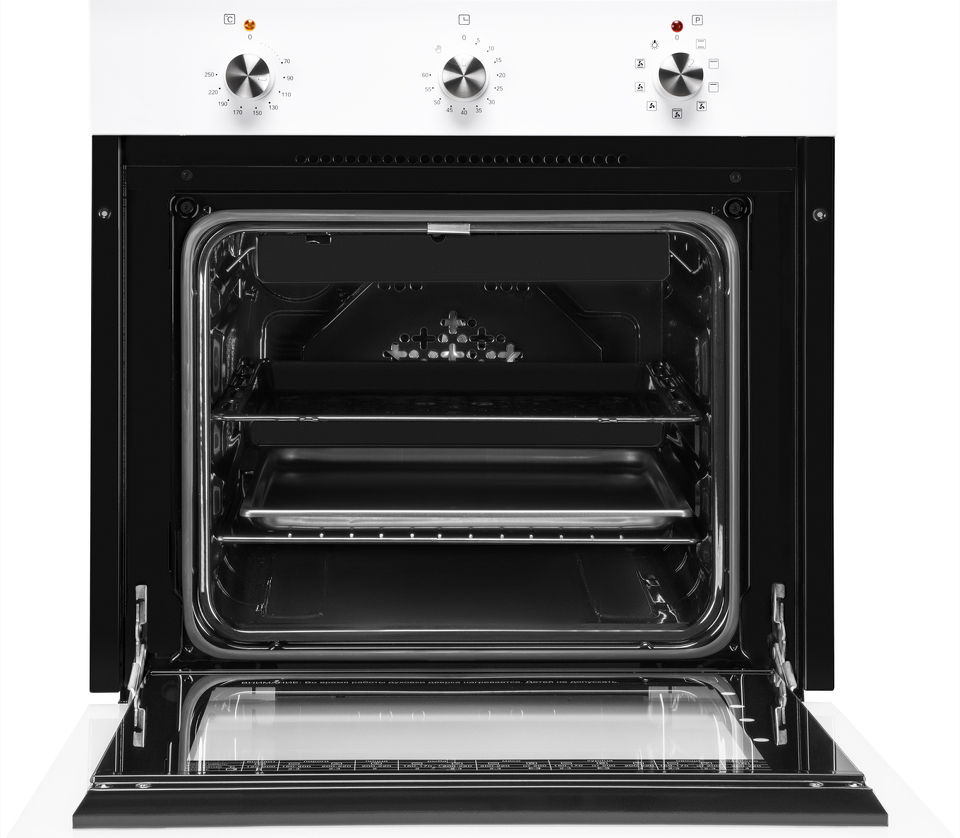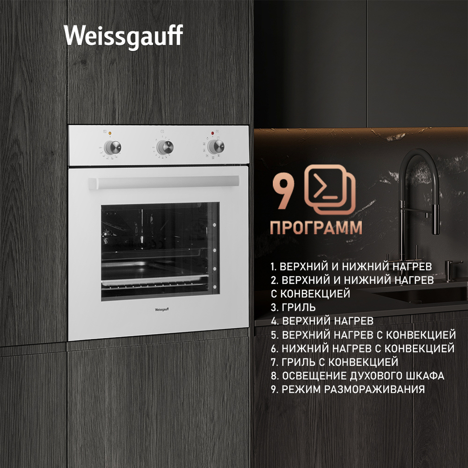 Электрический духовой шкаф от Weissgauff, выполненный в белом цвете, оснащённый механическими поворотными рукоятками Soft Switch, двойным остеклением дверцы и 9 режимами, буквально олицетворяет собой уверенность в надёжном и функциональном оснащении вашей кухни!