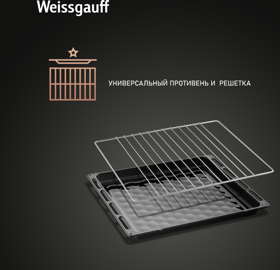 Объем 50 литров дает вам полную уверенность в том, что приобретая этот духовой шкаф, вы сможете разместить в нем сразу весь необходимый объем пищи, и даже профессионально работать на нескольких уровнях одновременно, порадовав себя и своих близких настоящим пиром, приготовленным в духовом шкафу Weissgauff на действительно ресторанном уровне.