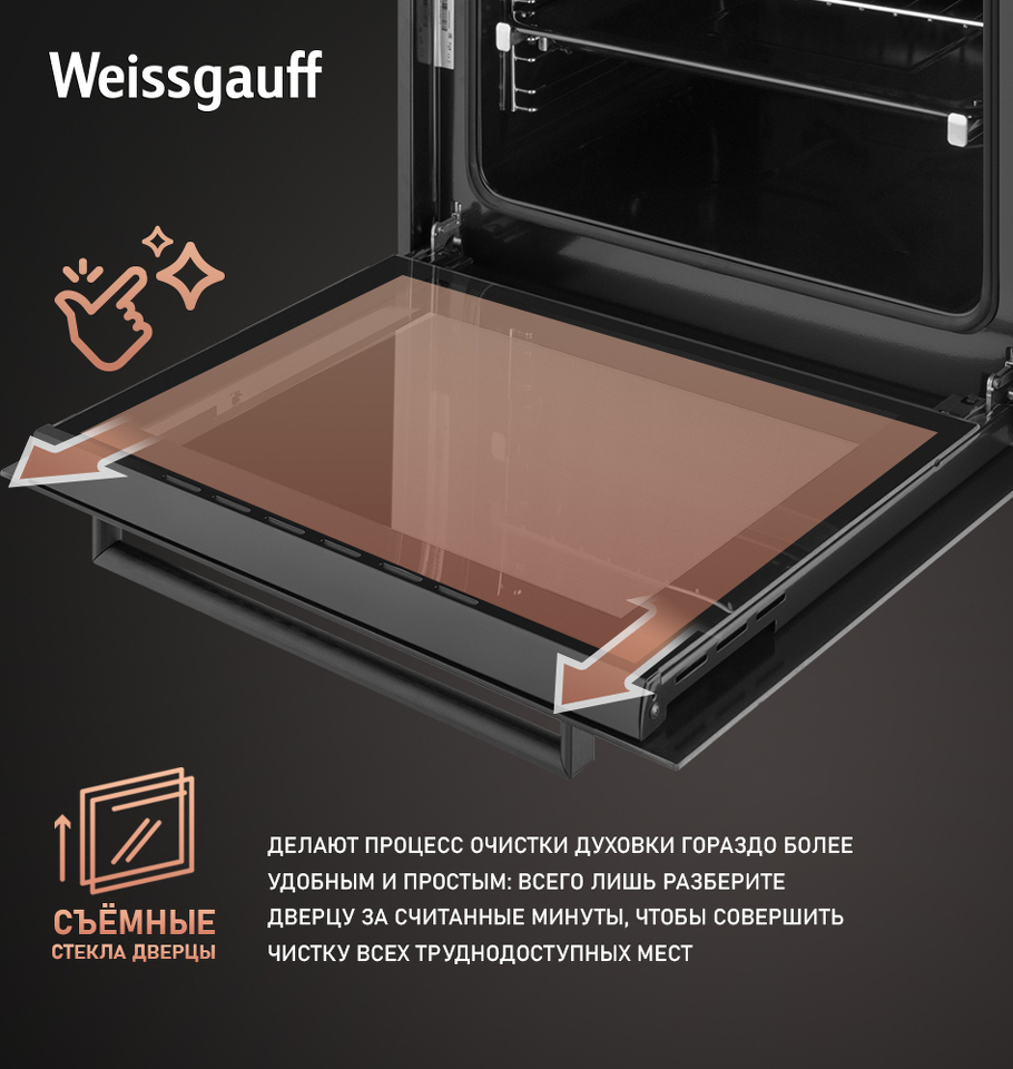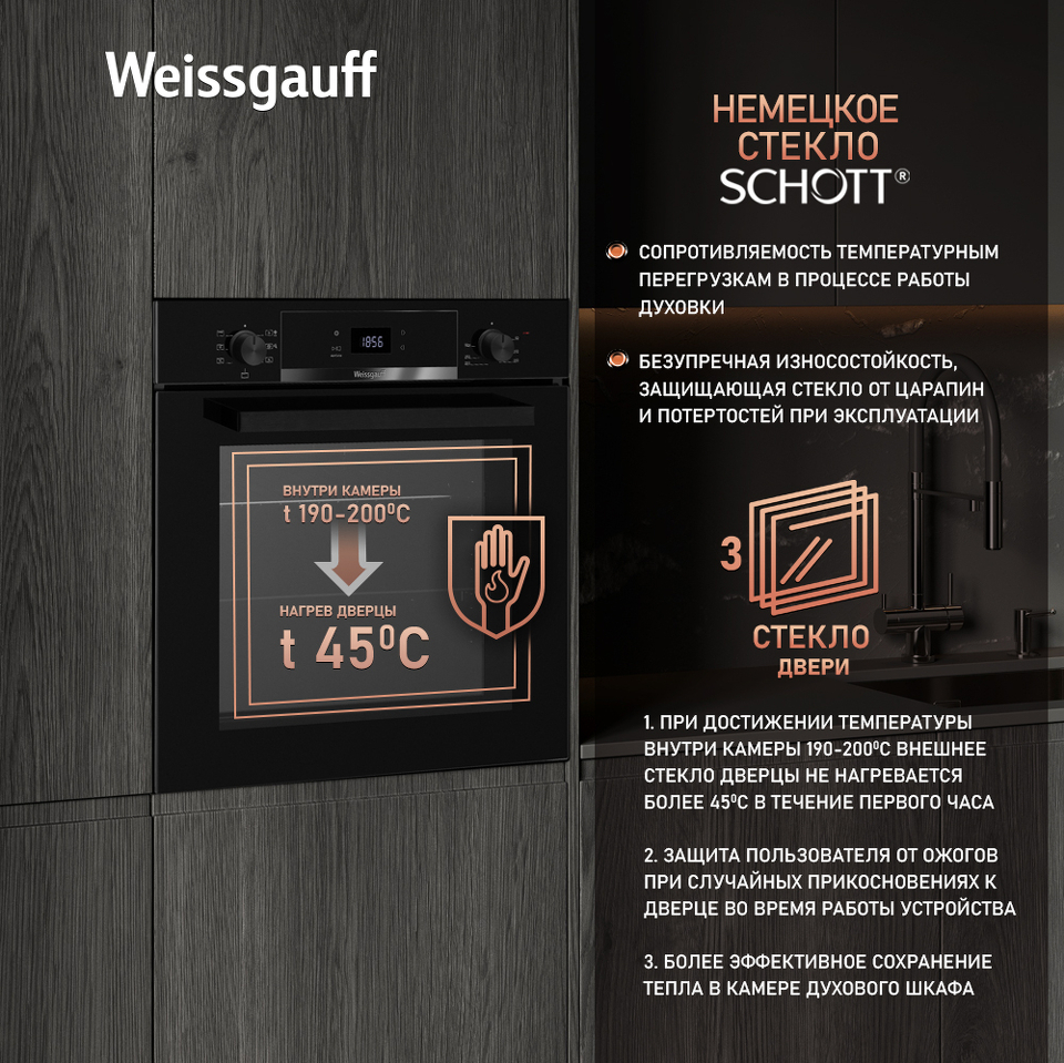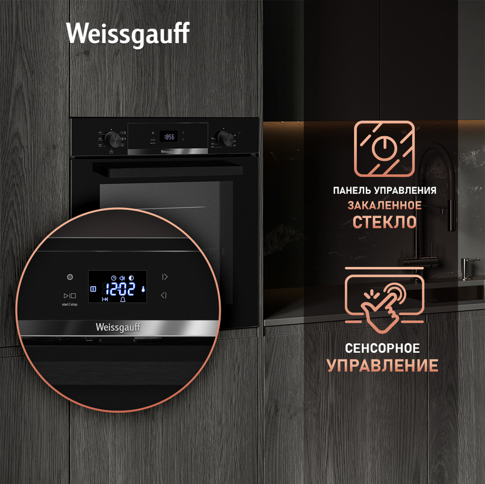 • Великолепный дизайн, дополненный вставкой из стекла под дисплеем, станет финальным штрихом в совершенстве облика этой модели. Каждый раз, взаимодействуя с духовым шкафом от Weissgauff, вы будете в полной мере ощущать, как он способен нагревать не только еду, но и согревать душу, став настоящим сердцем вашего уютного домашнего очага