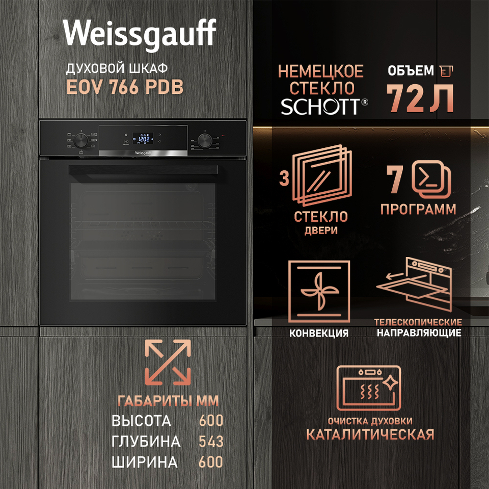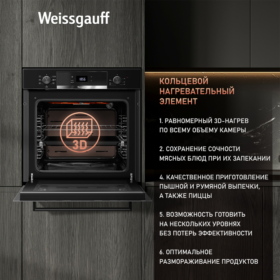 Новое поколение электрических духовых шкафов от Weissgauff предлагает модель, выполненную в черном цвете. Управление, реализованное сочетанием чувствительного сенсорного блока и утапливаемых черных рукояток PIPO, дополняет богатый функционал, представленный сразу 7 режимами! А фантастический увеличенный объем XL 72 литра дополнит совершенство возможностей этого устройства! Благодаря всему этому вы сможете полностью управлять процессом приготовления пищи, добиваясь идеального результата каждый раз! Духовой шкаф Weissgauff станет не только отличным приобретением для вашей кухни, но и настоящим украшением интерьера, отражающим все благородство вашего вкуса и стиля!