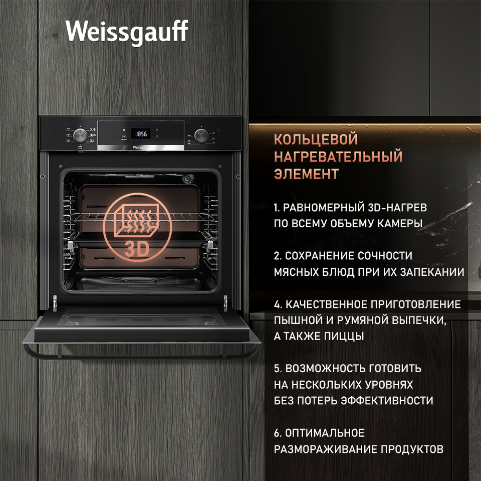 Кольцевой нагревательный элемент, для равномерного 3D-нагрева, обеспечит по-настоящему качественное и эффективное запекание приготавливаемого блюда благодаря более эффективному распределению тепла в камере духового шкафа.