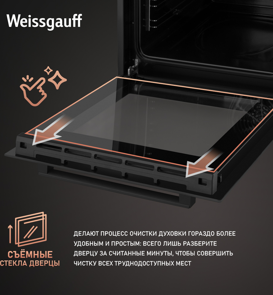 • Гидролизная очистка - особая технология, благодаря который вы раз и навсегда забудете те дни, когда духовой шкаф необходимо было с большим трудом вычищать, вкладывая в это непозволительно много времени и сил. Weissgauff понимает, что в современном мире время является одной из наивысших ценностей - поэтому мы оснастили данную модель функцией гидролиза: всего лишь добавьте небольшое количество воды, и духовой шкаф сам отпарит все загрязнения, используя "эффект сауны", после чего вам останется лишь провести по стенкам мягкой губкой, собрав их и удалив одним движением.